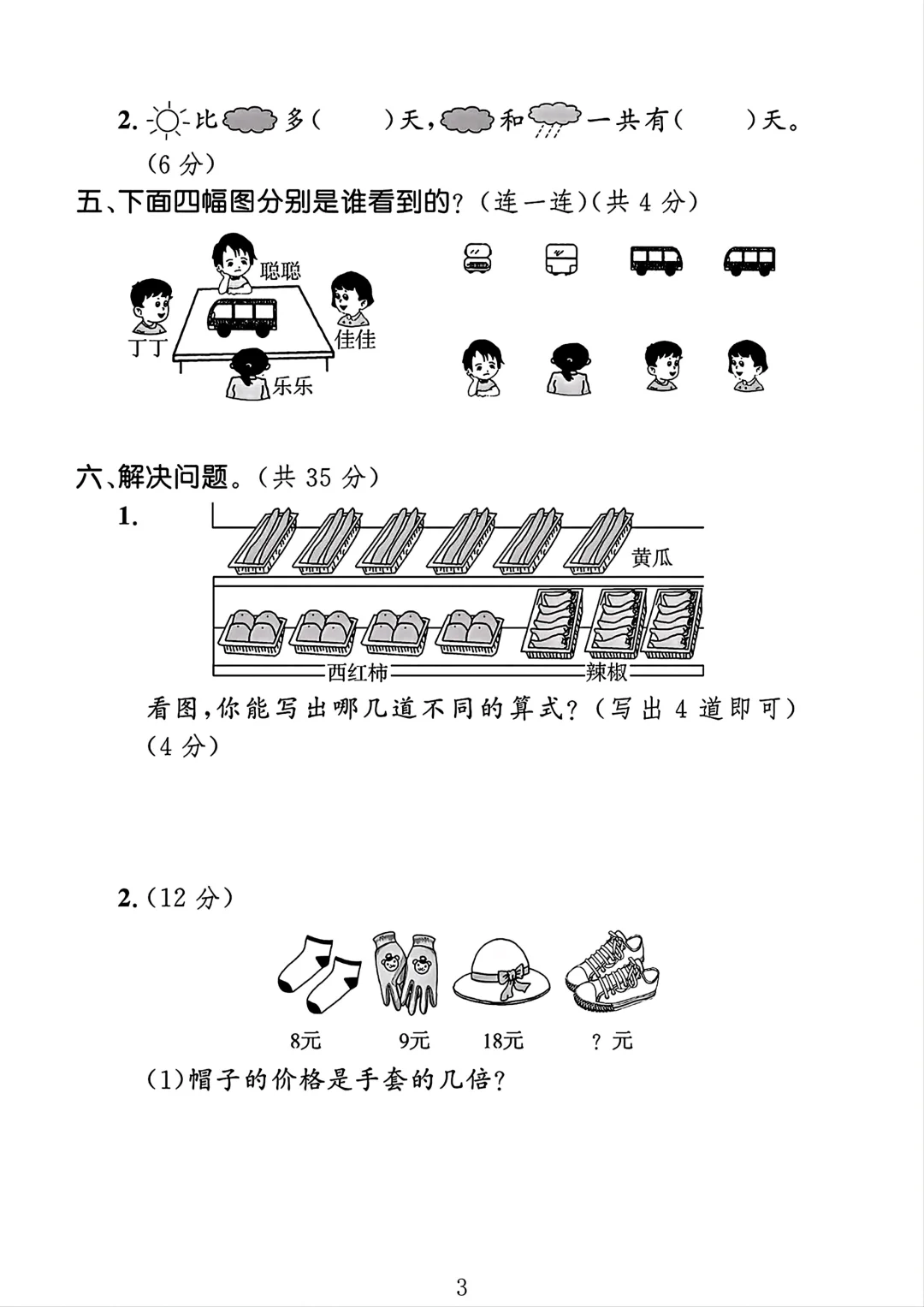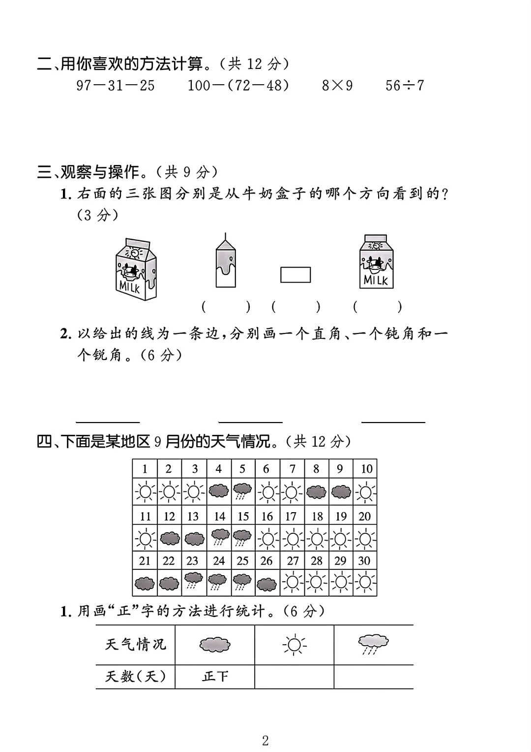 冀教版 二年级上册数学 期末试卷 期末考试 期末 试卷 电子版可打印