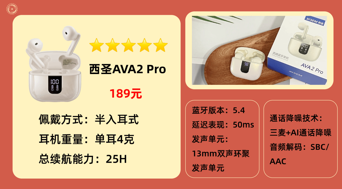 ①百元价位:西圣 AVA2 Pro(189元)——拥有十余年音视频领域的深厚技术积累,百元价位拥有千元音质。