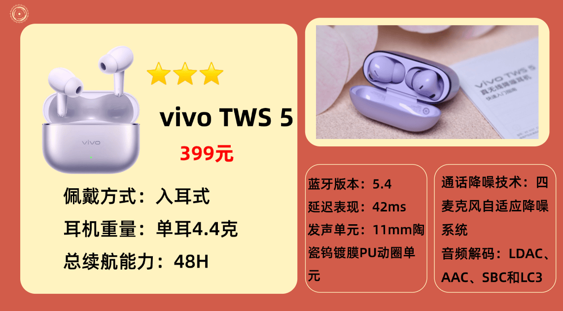 2:音质方面,vivo TWS 5最大的升级来自达发(AIROHA)蓝牙芯片平台,告别高通方案后带来了更灵活的编码支持。标准版支持AAC与LDAC,Hi-Fi版则新增LHDC V5 / LHDC Lossless无损协议,最高码率可达1.4Mbps。11mm动圈单元调音偏均衡,低频弹性强,不过稍微有点轰脑,中高频层次清晰,人声饱满自然。蓝牙5.4连接稳定,延迟控制不错。续航方面单次可以使用12小时,搭配充电仓可以使用48小时。