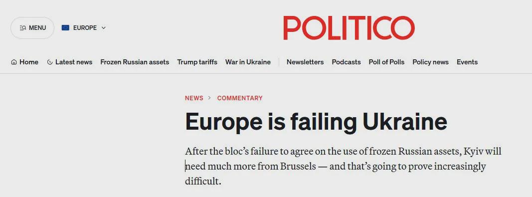 该媒体得出这一结论的依据是,欧盟未能就动用被冻结的俄罗斯资产,向乌克兰提供2100亿欧元以维持乌军再支撑两年达成一致,目前谈妥的900亿欧元贷款无法实现这一目标。