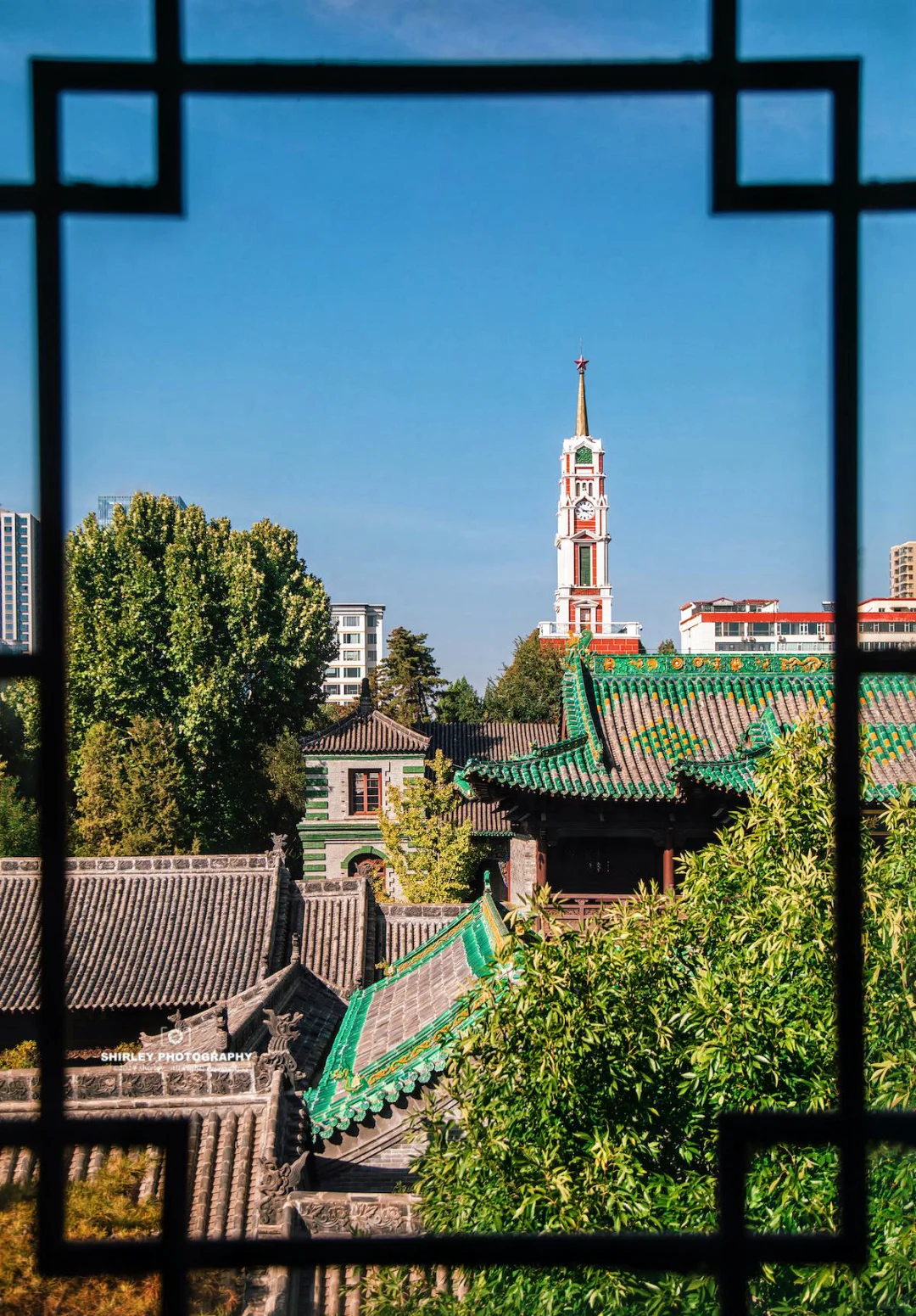 太原地标之一,整个建筑群的压轴建筑。现在看到的是1952年重修版,保留仿哥特式塔尖,顶部加上了⭐️。