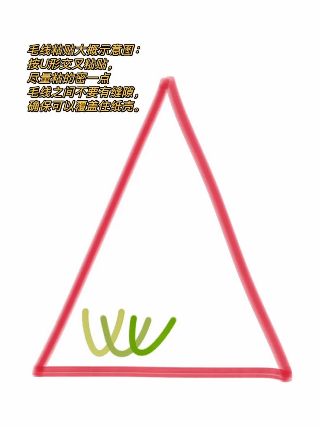 3️⃣剪好的毛线用U形交叉的方法,用热熔胶粘贴(如P13示意),从下往上一圈圈覆盖,粘的密集一些,可避免纸壳露出;