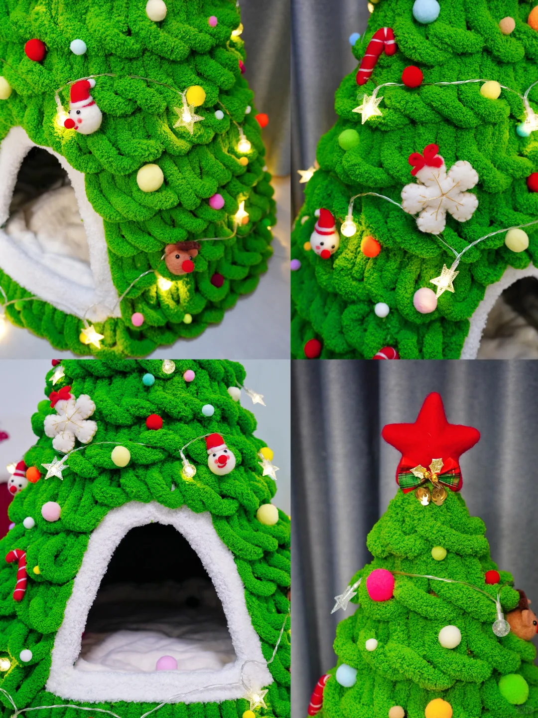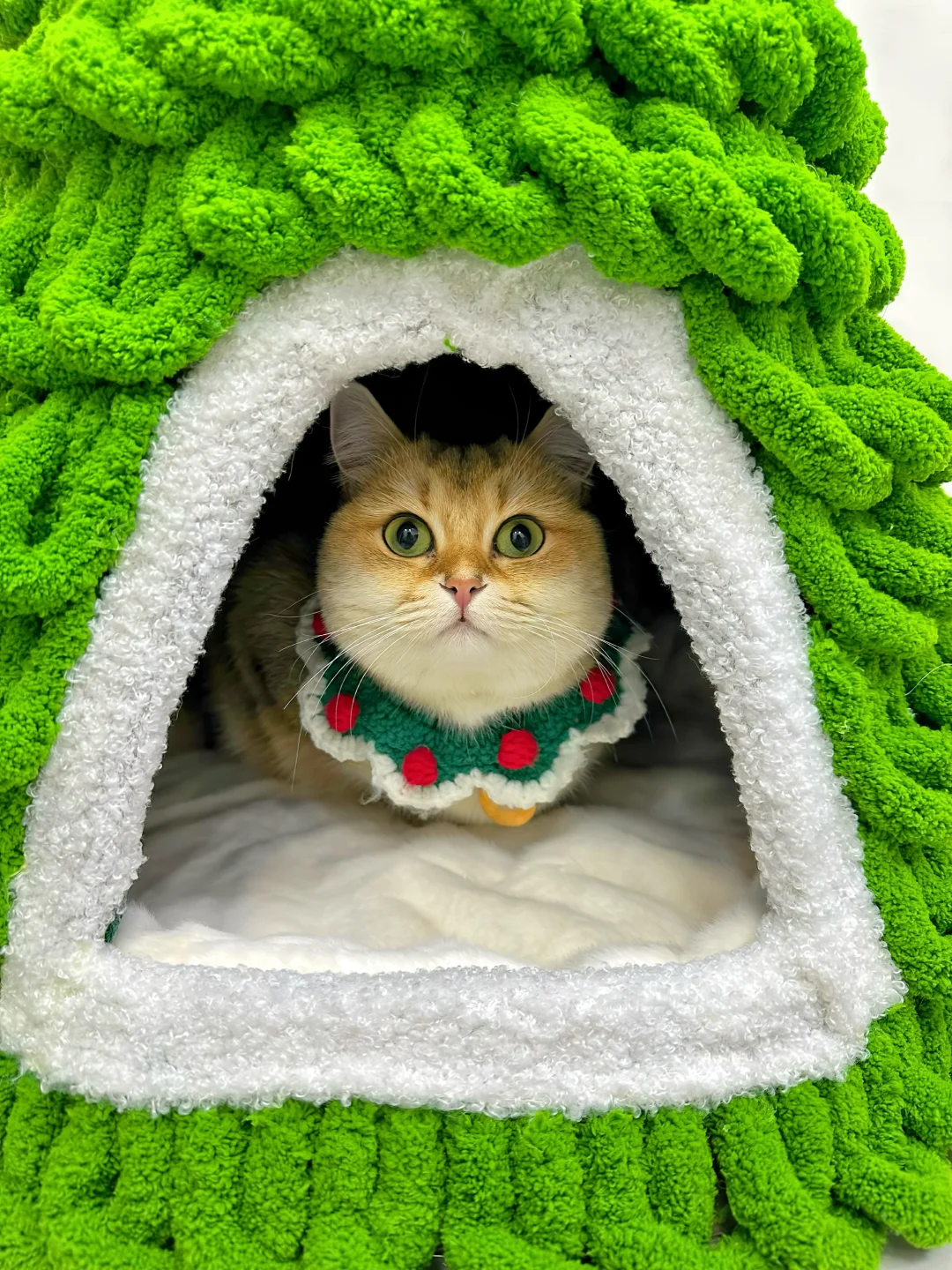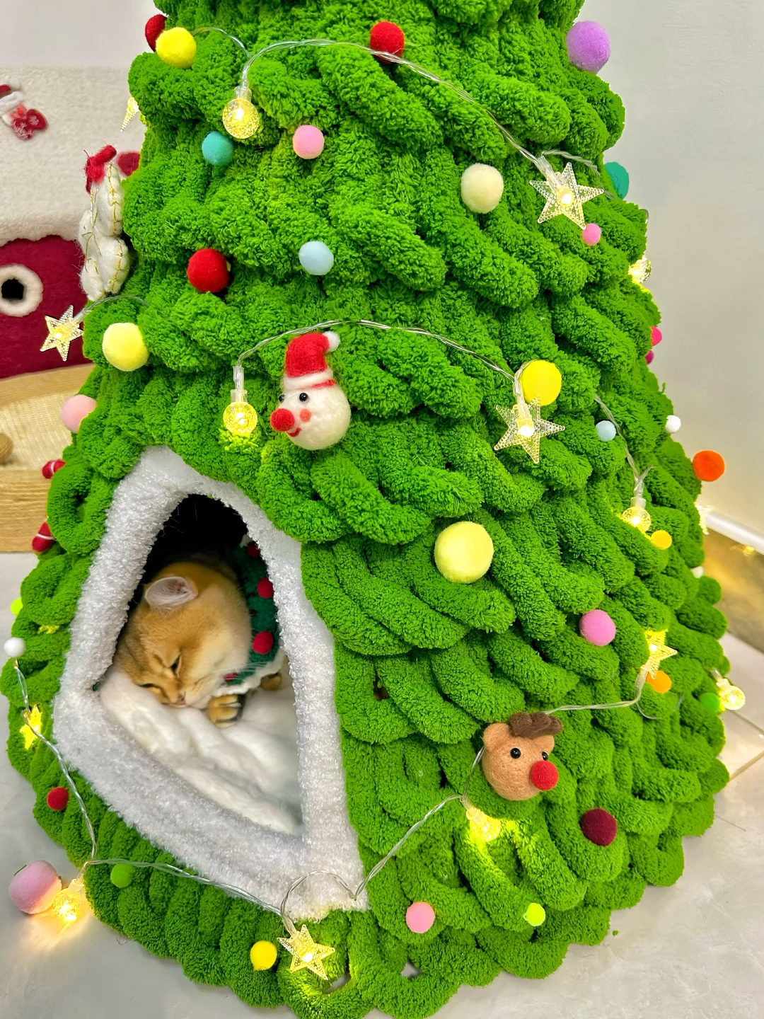 7️⃣最后放一个柔软的猫窝垫,舒服又暖和的圣诞树猫窝就做好了!