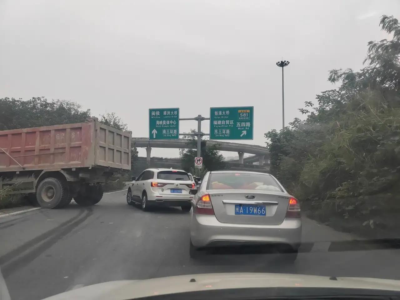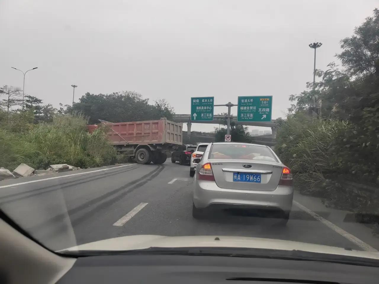 福州魁浦大桥南侧引桥 2024年12月8日1点50分车祸 一辆货车冲进路边坡,剩下一部分在路上,两部小车被撞伤,幸无人员死伤。