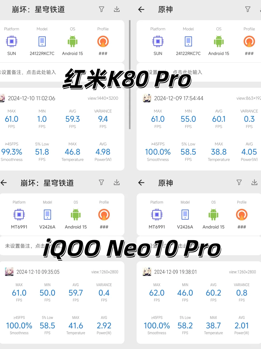 温度:崩铁iQOO的表现好很多[喝奶茶R][喝奶茶R],红米的温度有点过高,测试过程中已经感觉到比较烫手了;原神里两款手机表现相似,都不到39℃,比较优秀[派对R][派对R][偷笑R]。