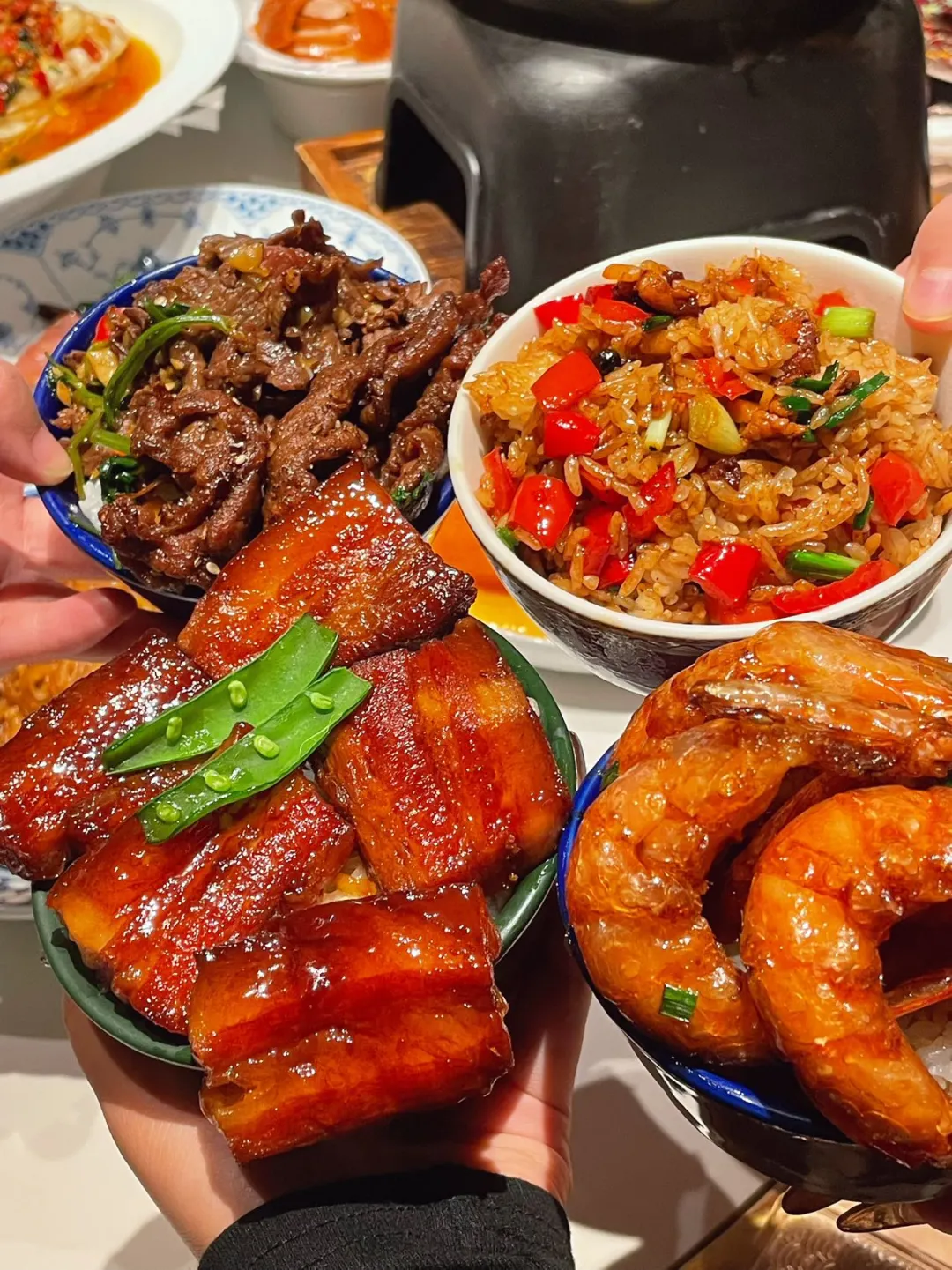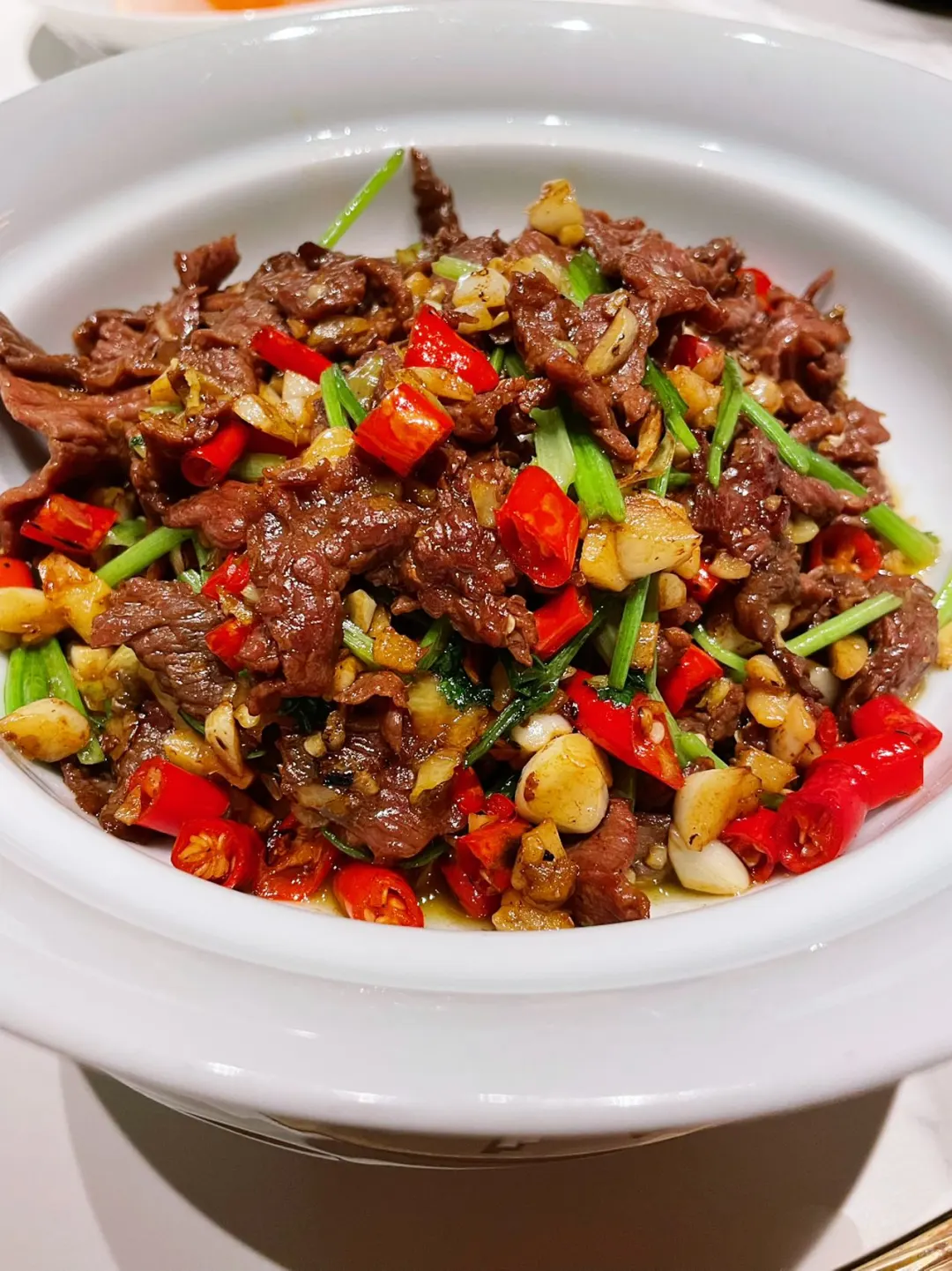在南京的美食江湖中,万象天地这家湘菜餐馆堪称一jue。 进门中式风情浓,服务很贴心,餐具与摆盘相衬,户外露台更是拍照佳处,还有包间😊 🥘剁椒蒸鱼头:剁椒酸辣劲爽,鱼肉鲜嫩爽滑,粉条吸饱浓郁汤汁,这搭配绝了,一口下去,幸福感爆棚! 🦆桂花酥小鸭:现点现切,皮酥肉嫩,桂花清香萦绕舌尖,每一口都是大写的满足! 🥩生炒黄牛肉:奶香与肉香交织,鲜嫩多汁,香辣过瘾,谁吃谁爱!