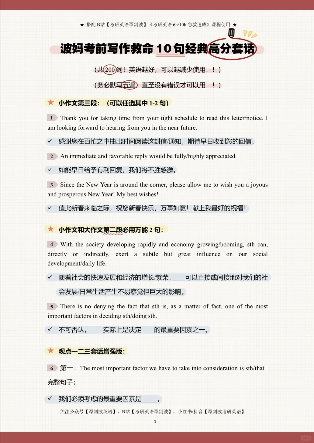 波妈为大家准备的10句写作救命高分套话。 共200词,务必默写5遍,没有错误才可使用!考前一定要打印下来好好复习!