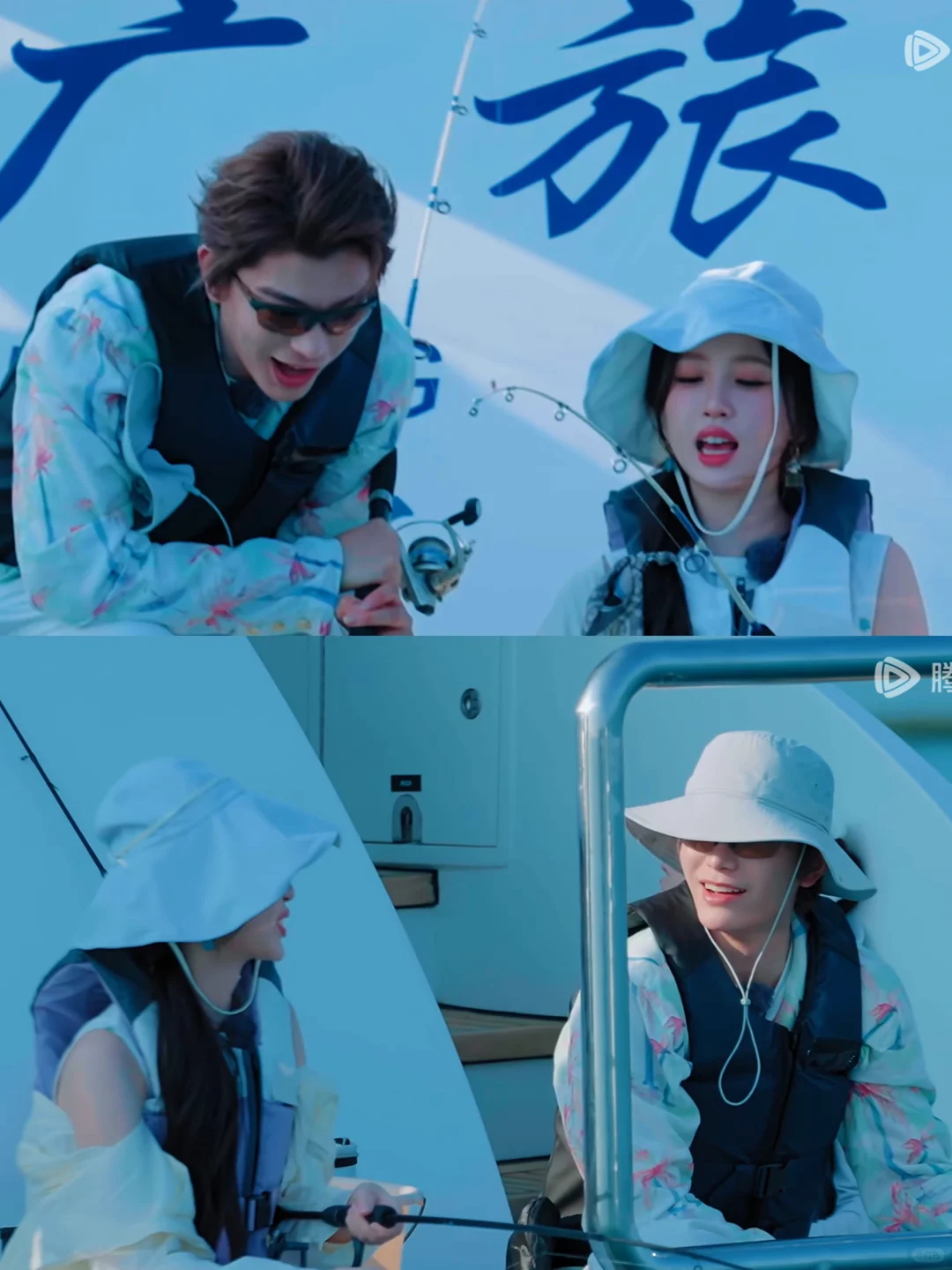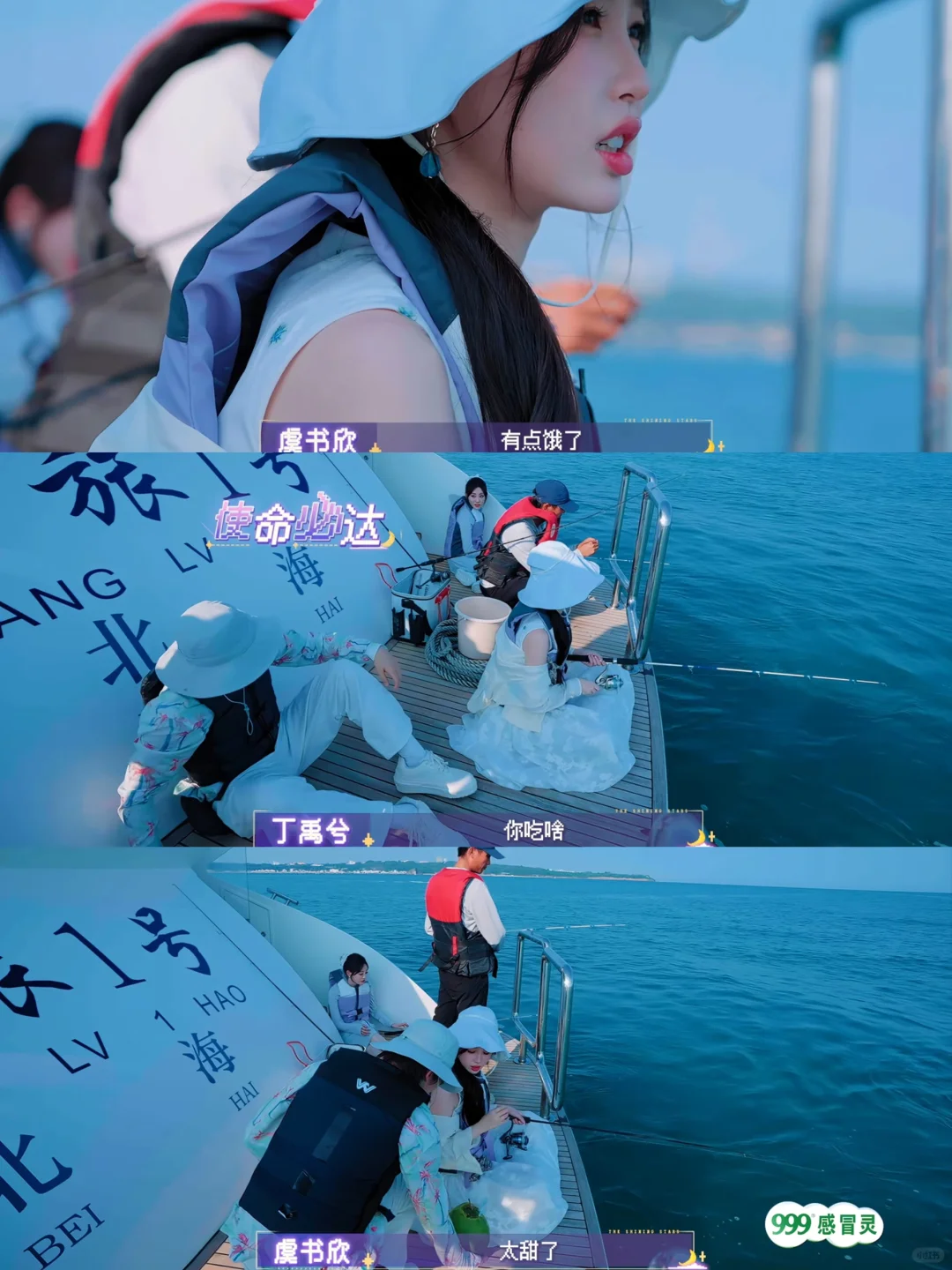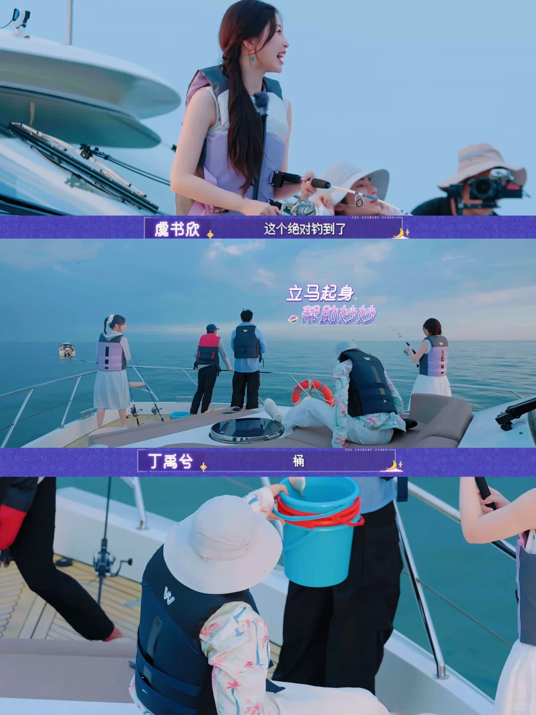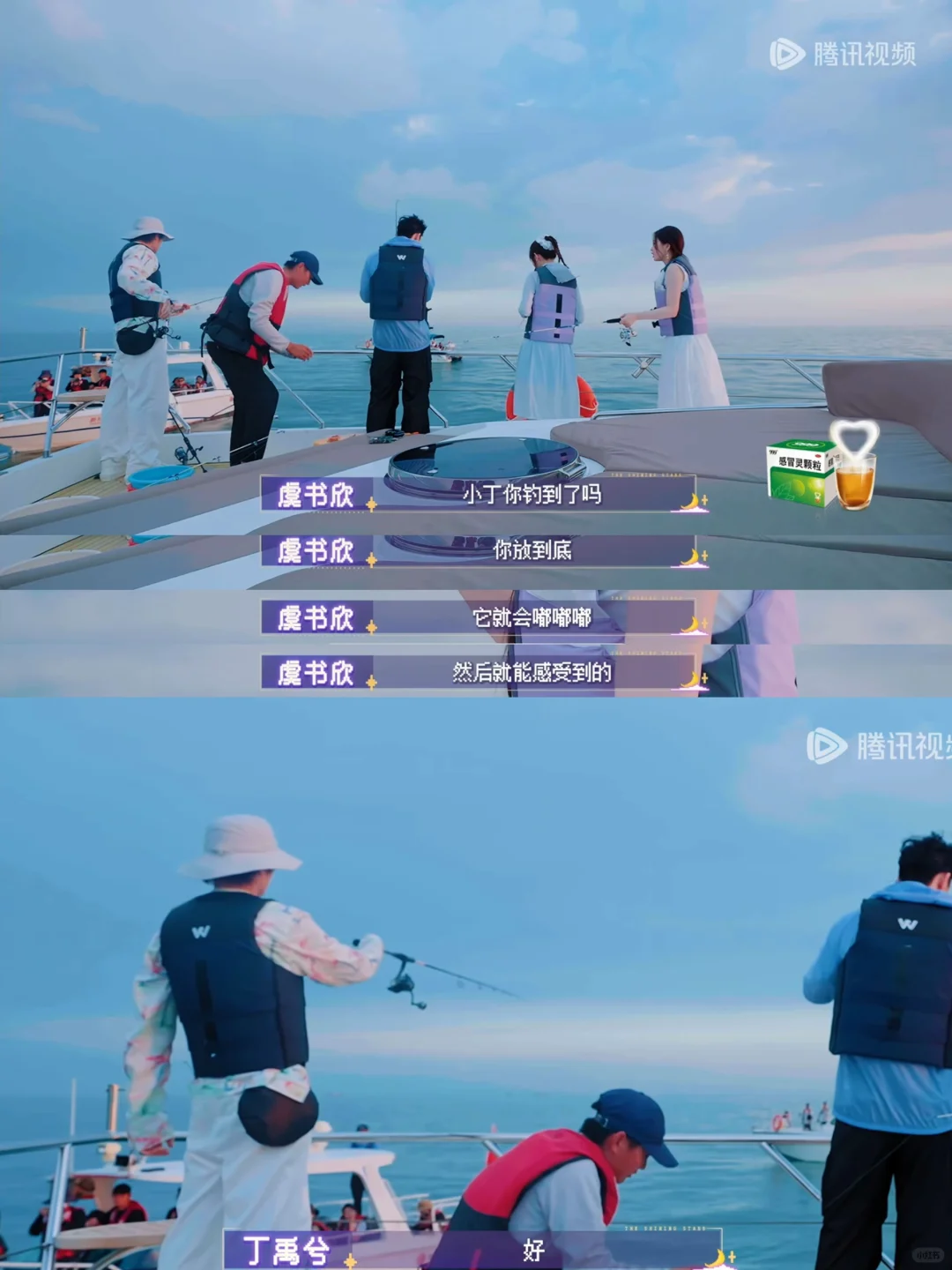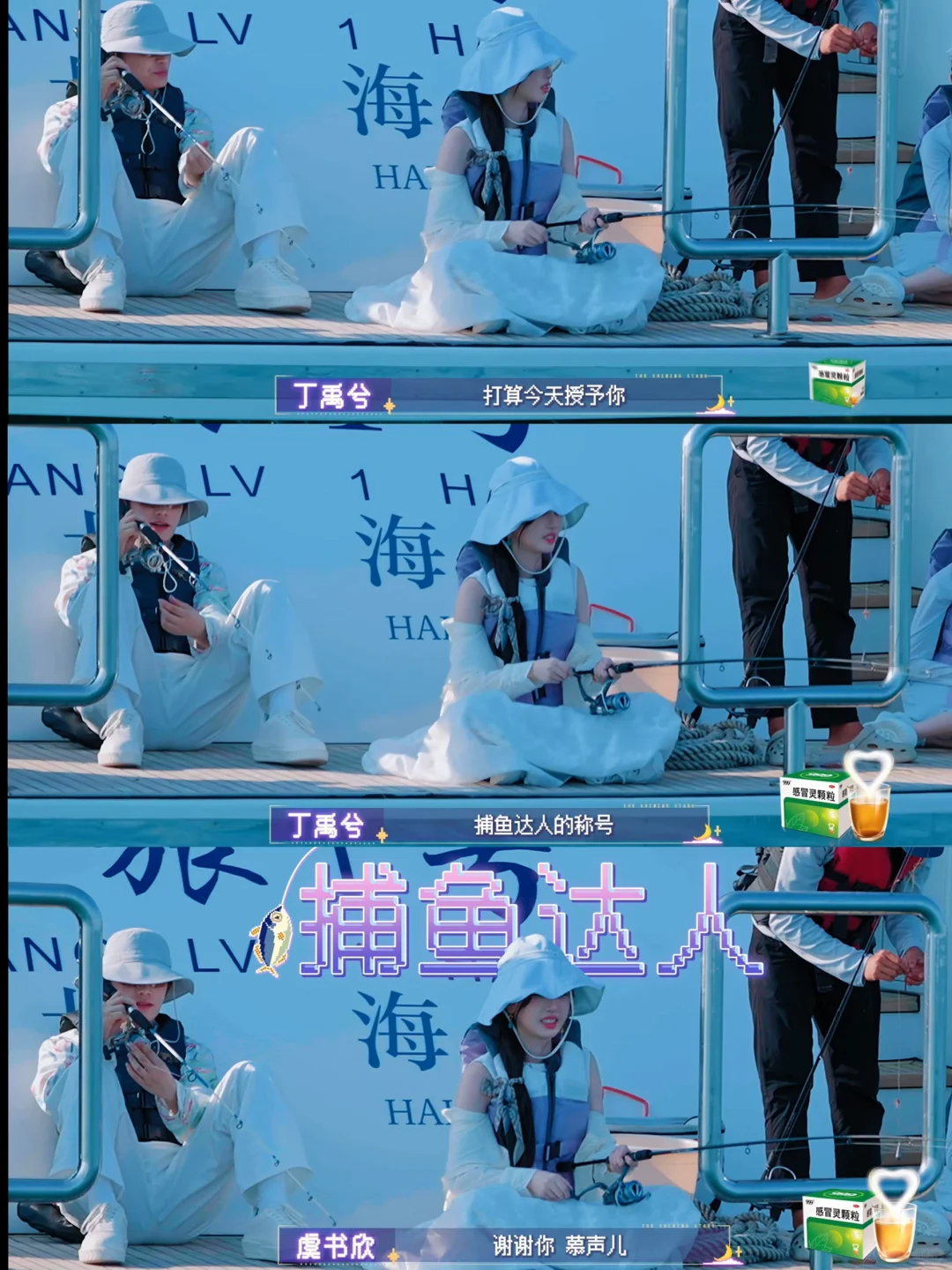 欣欣钓到一条鱼,本来躺着的小丁立刻爬起来给她拿桶接🐟。