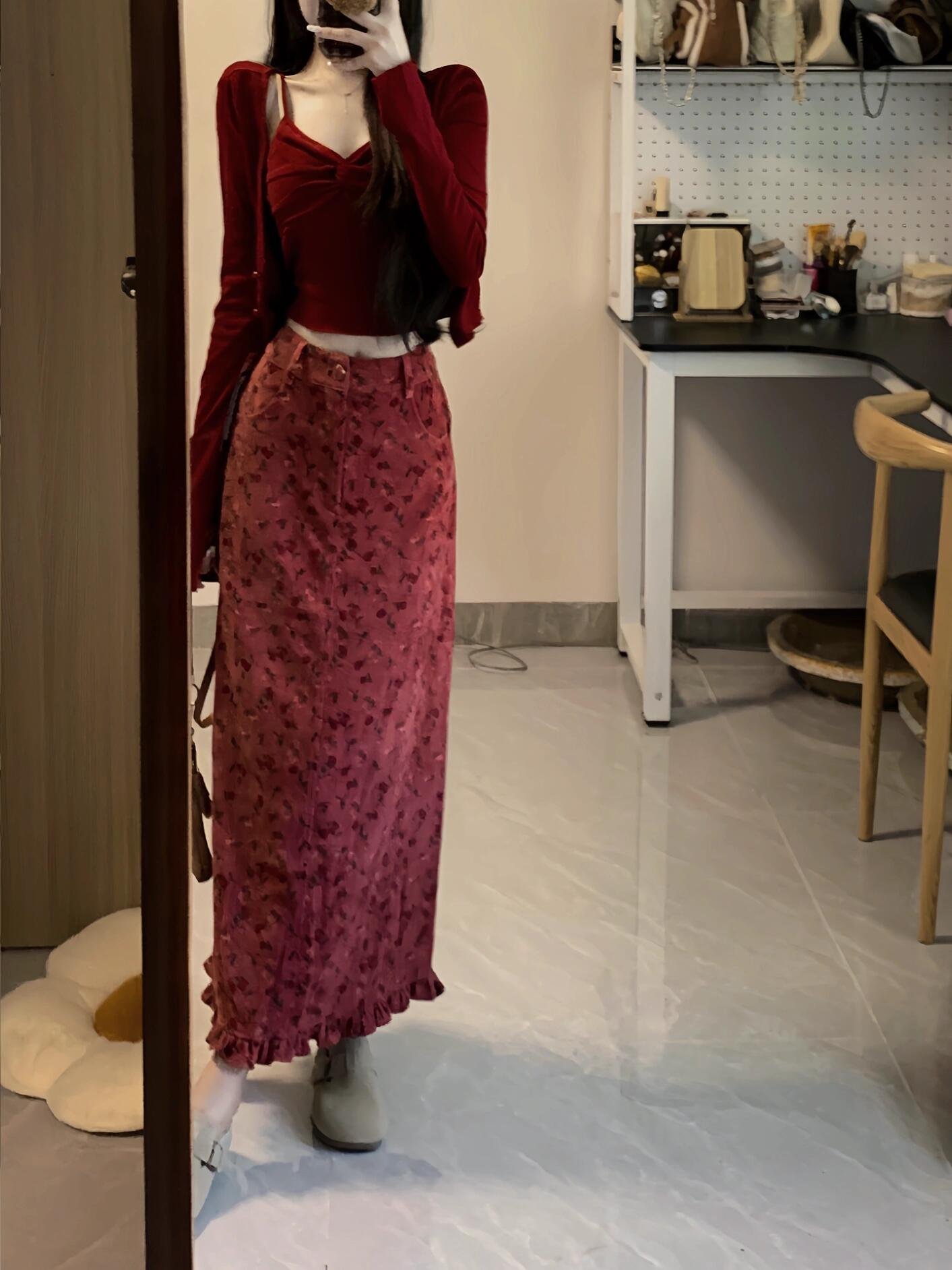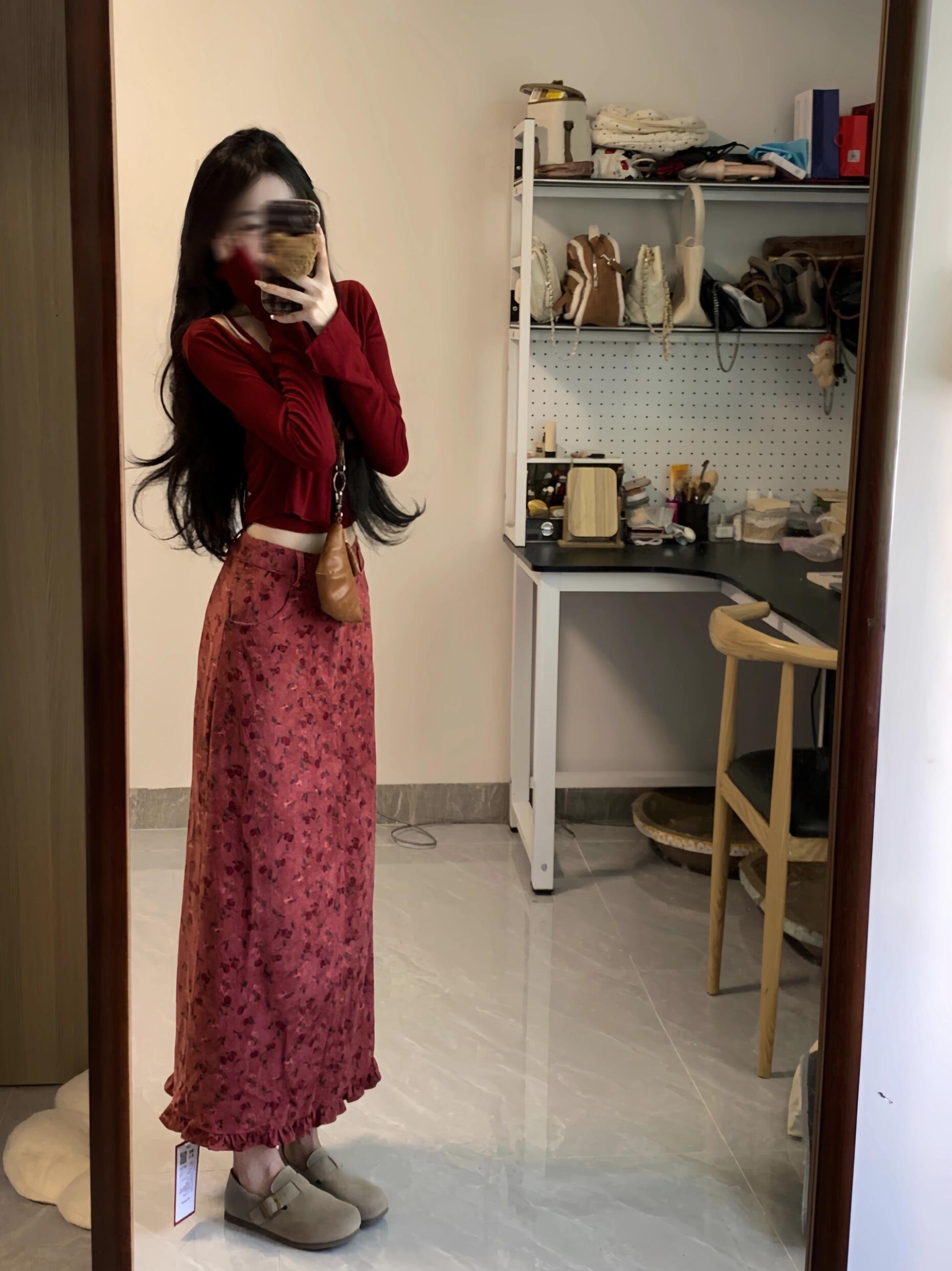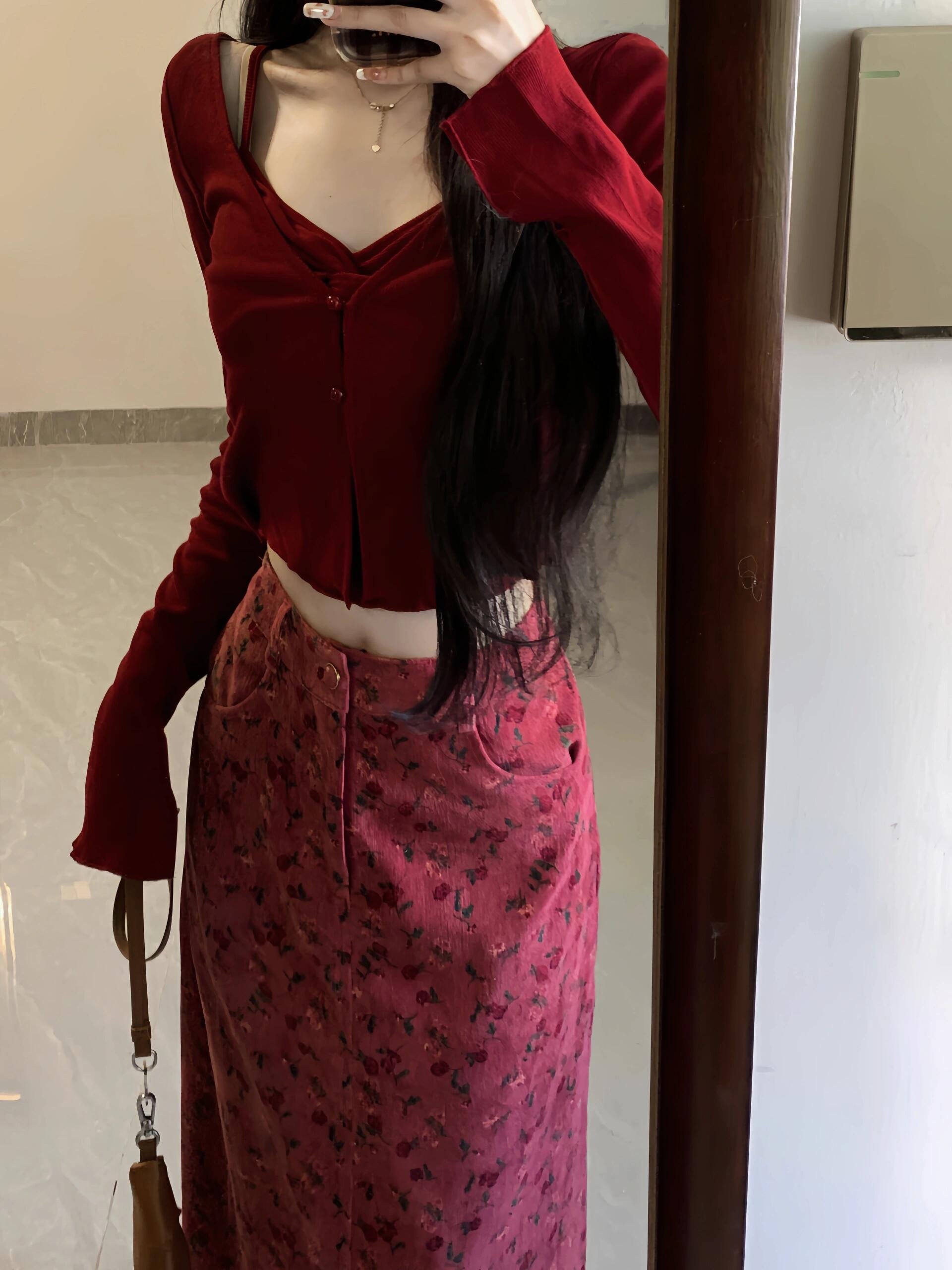 红色碎花包臀裙三件套真的好复古氛围感美女
