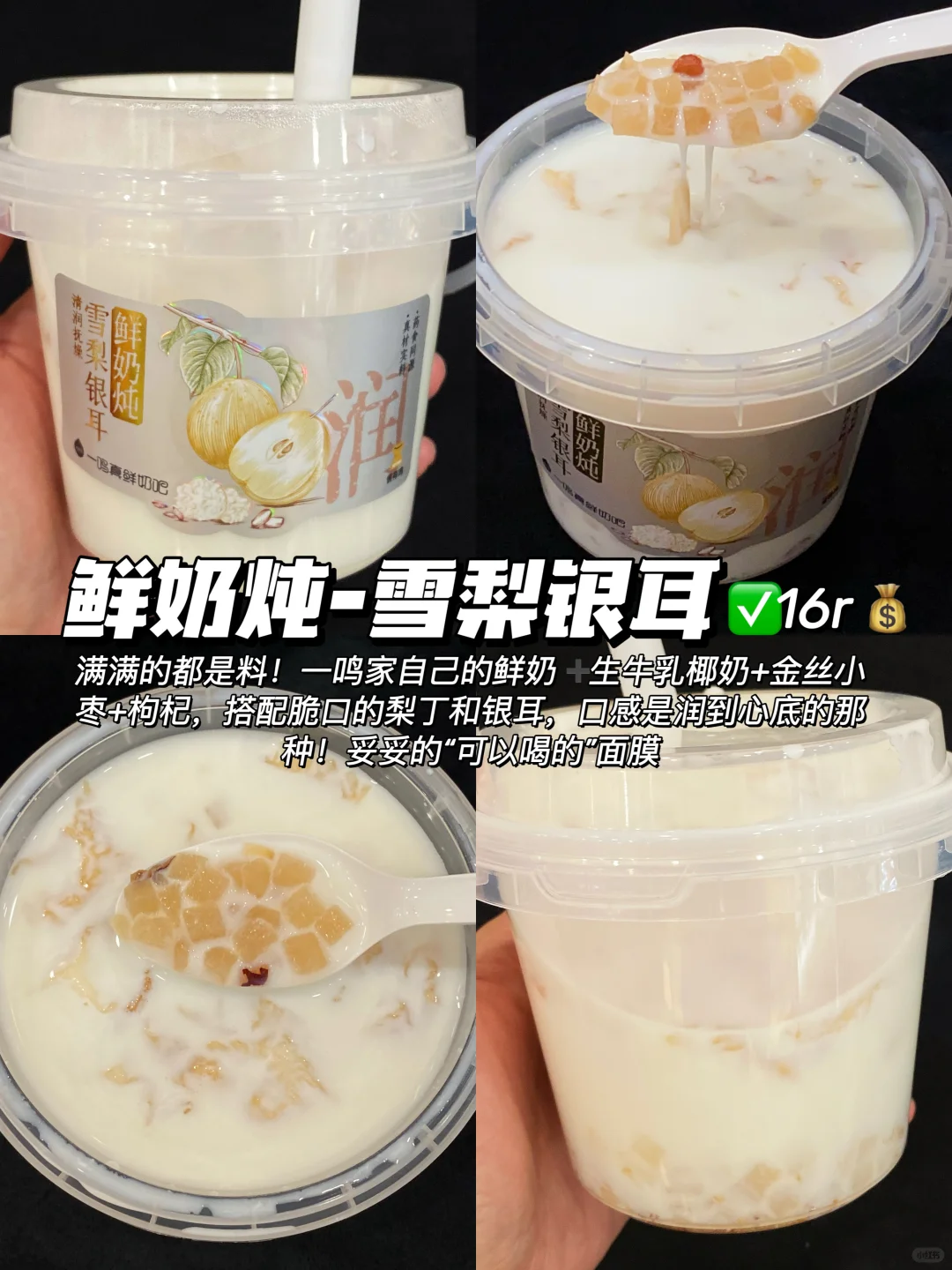 满满的都是料!一鸣自己的鲜奶➕生牛乳椰奶+金丝小枣+枸杞,脆口的梨丁和银耳,水水润润!妥妥的“可以喝的”面膜