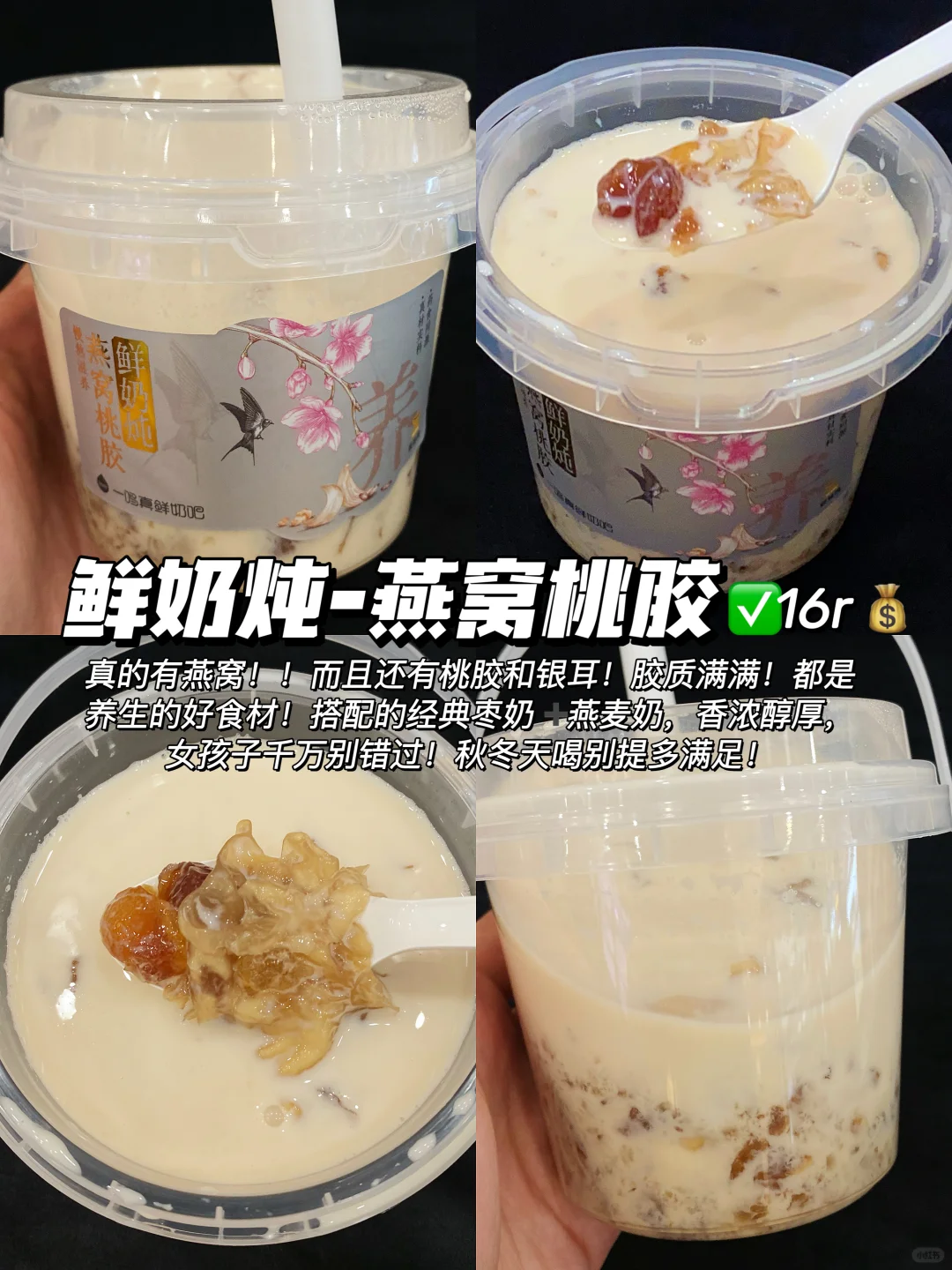 真的有燕窝!还有桃胶和银耳!胶质满满!养生的好食材!搭配经典枣奶➕燕麦奶,香浓醇厚,女孩子千万别错过!秋冬天喝巨满足