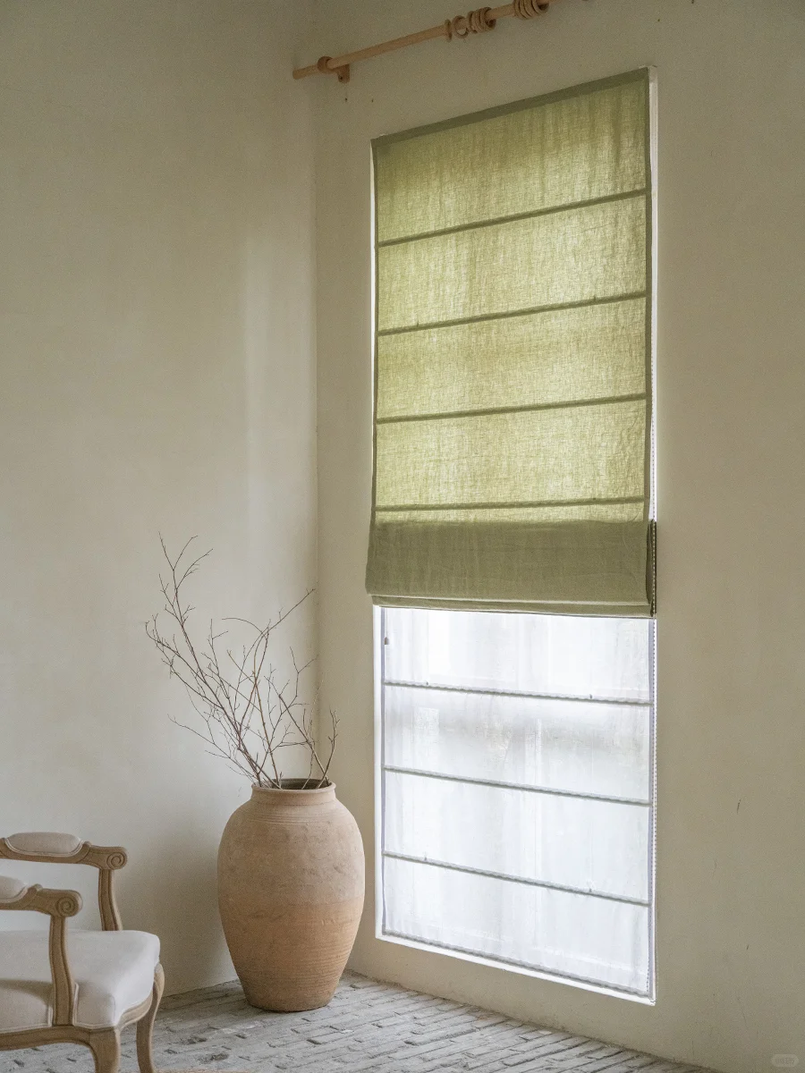 雨天之绿+本白纱丨双层罗马帘丨纯亚麻