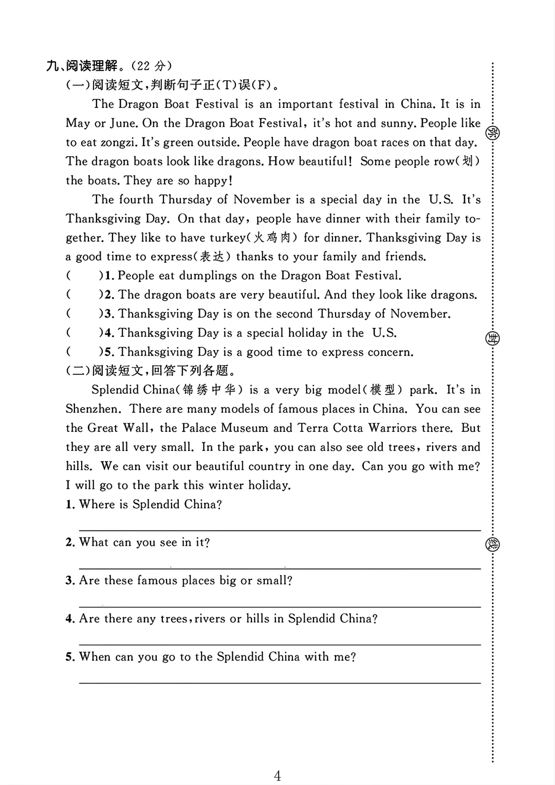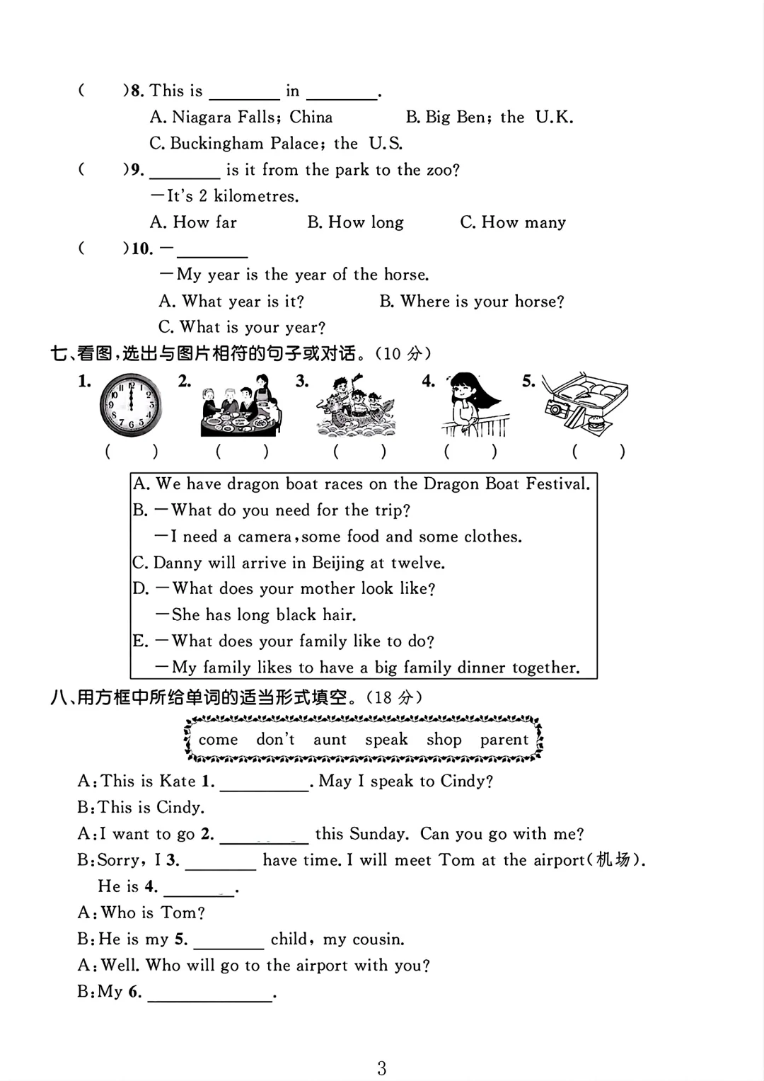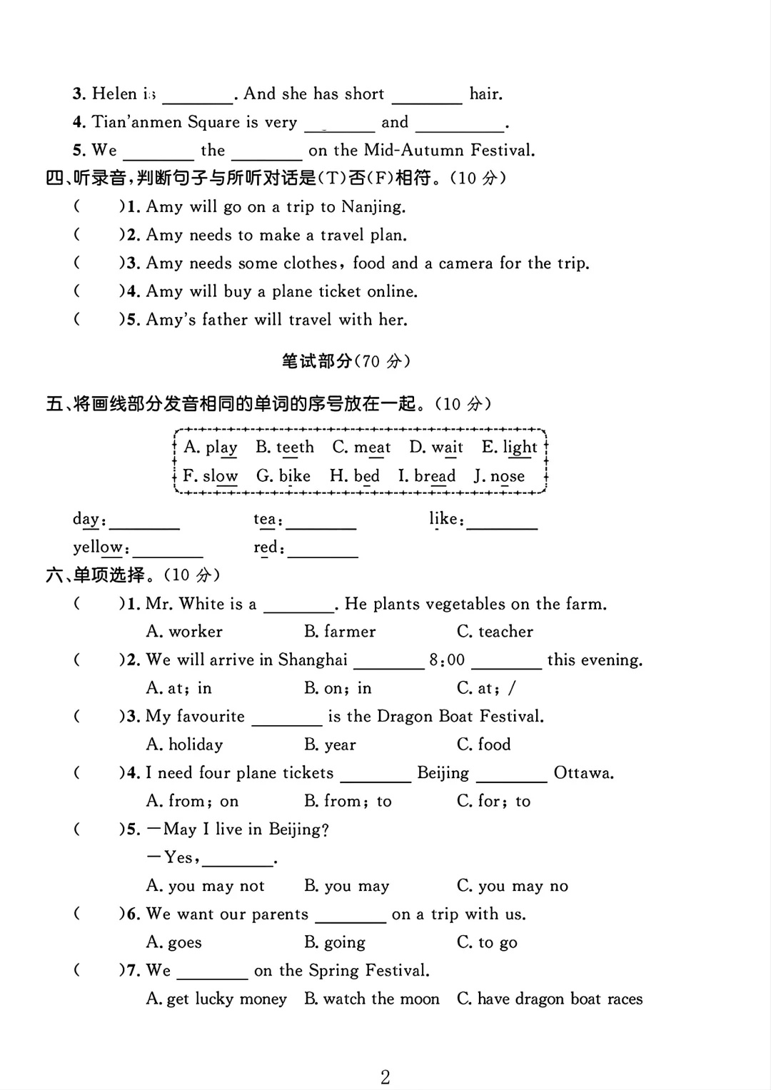冀教版小学英语 五年级上册英语 期末 试卷 期末考试 电子版可打印