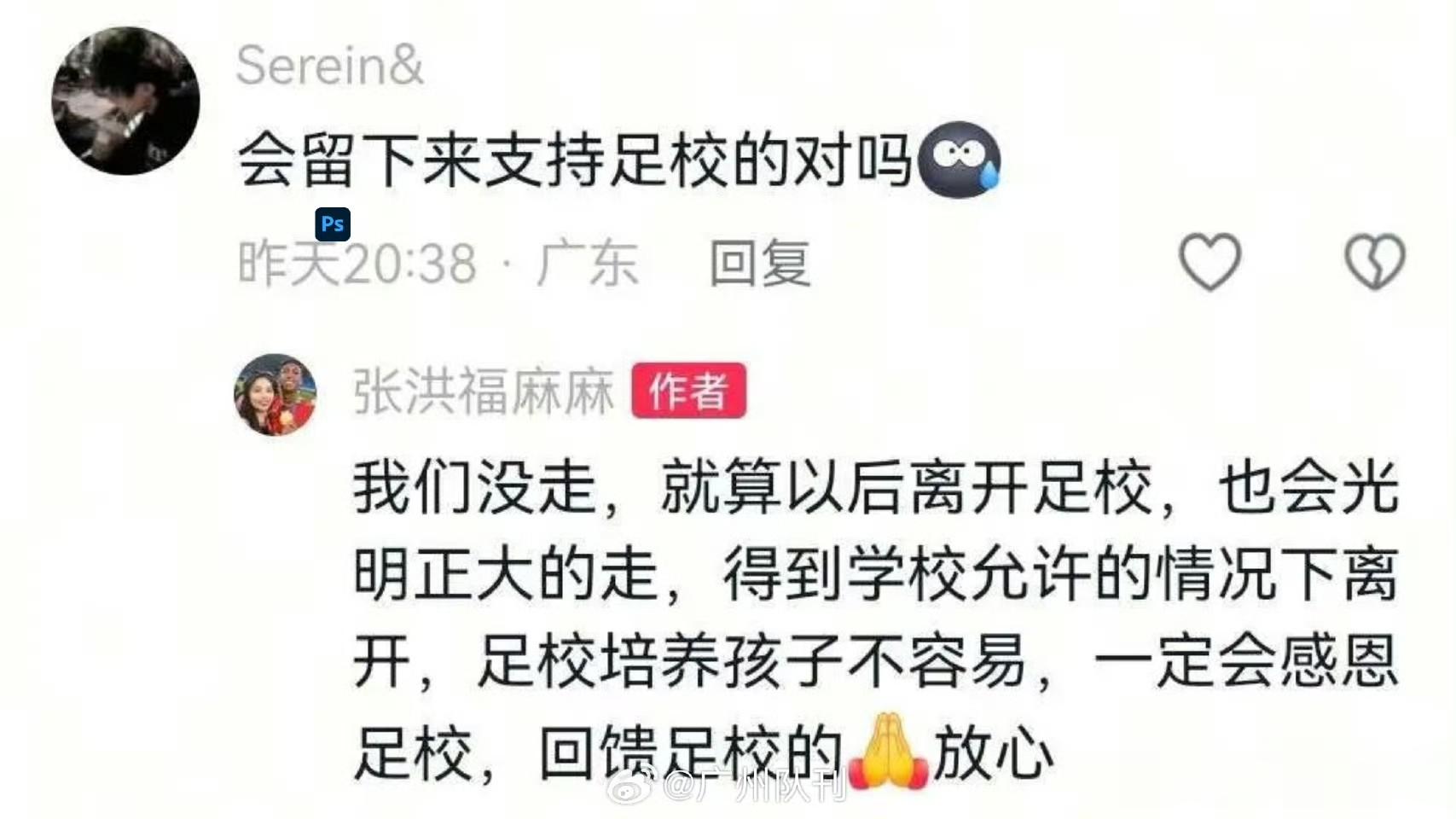 张洪福的妈妈就说到“我们没走, 就算以后离开足校,也会光明正大的走,得到学校允许的情况下离开,足校培养孩子不容易,一定会感恩足校, 回馈足校的放心”