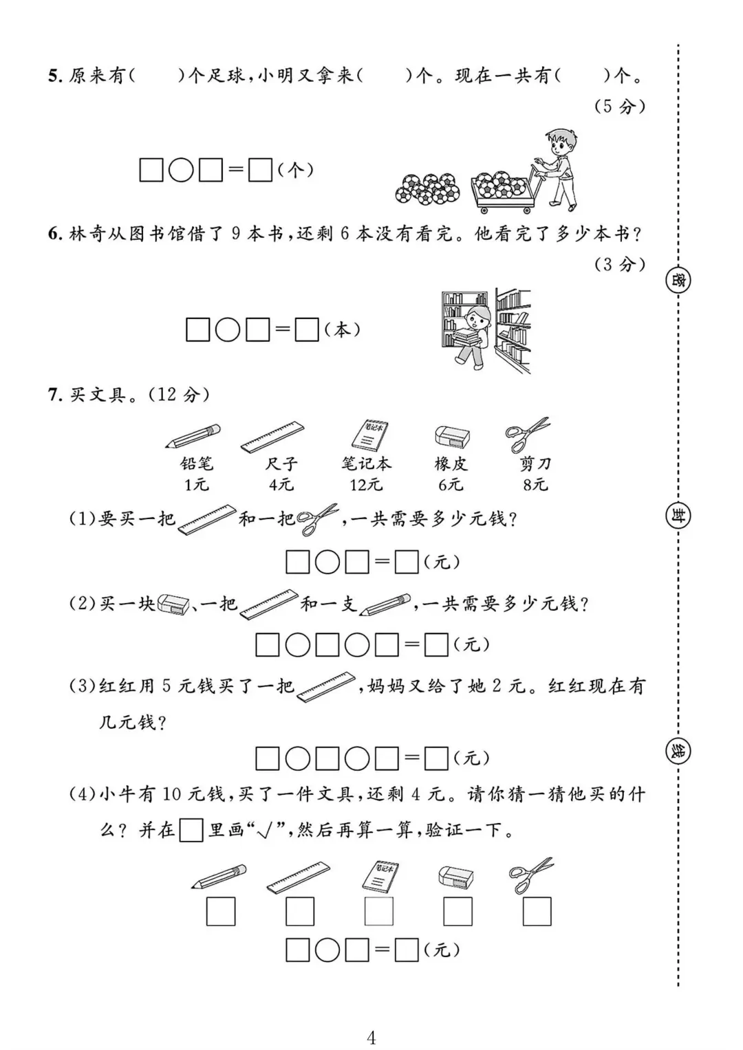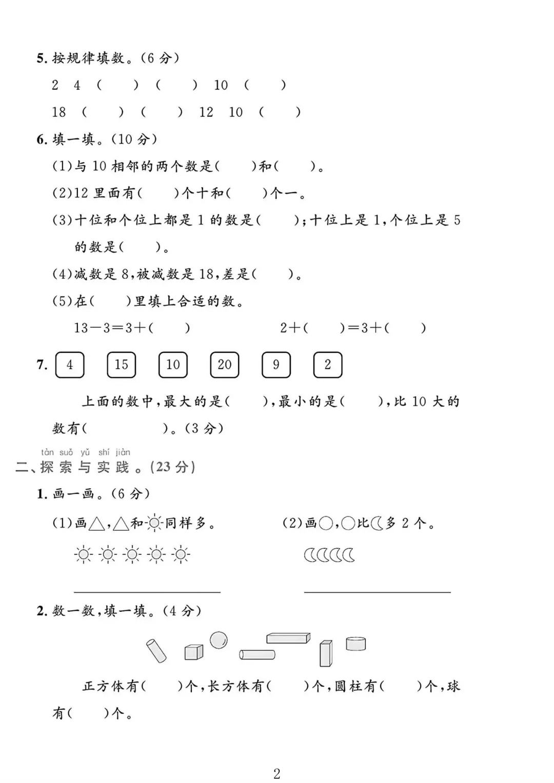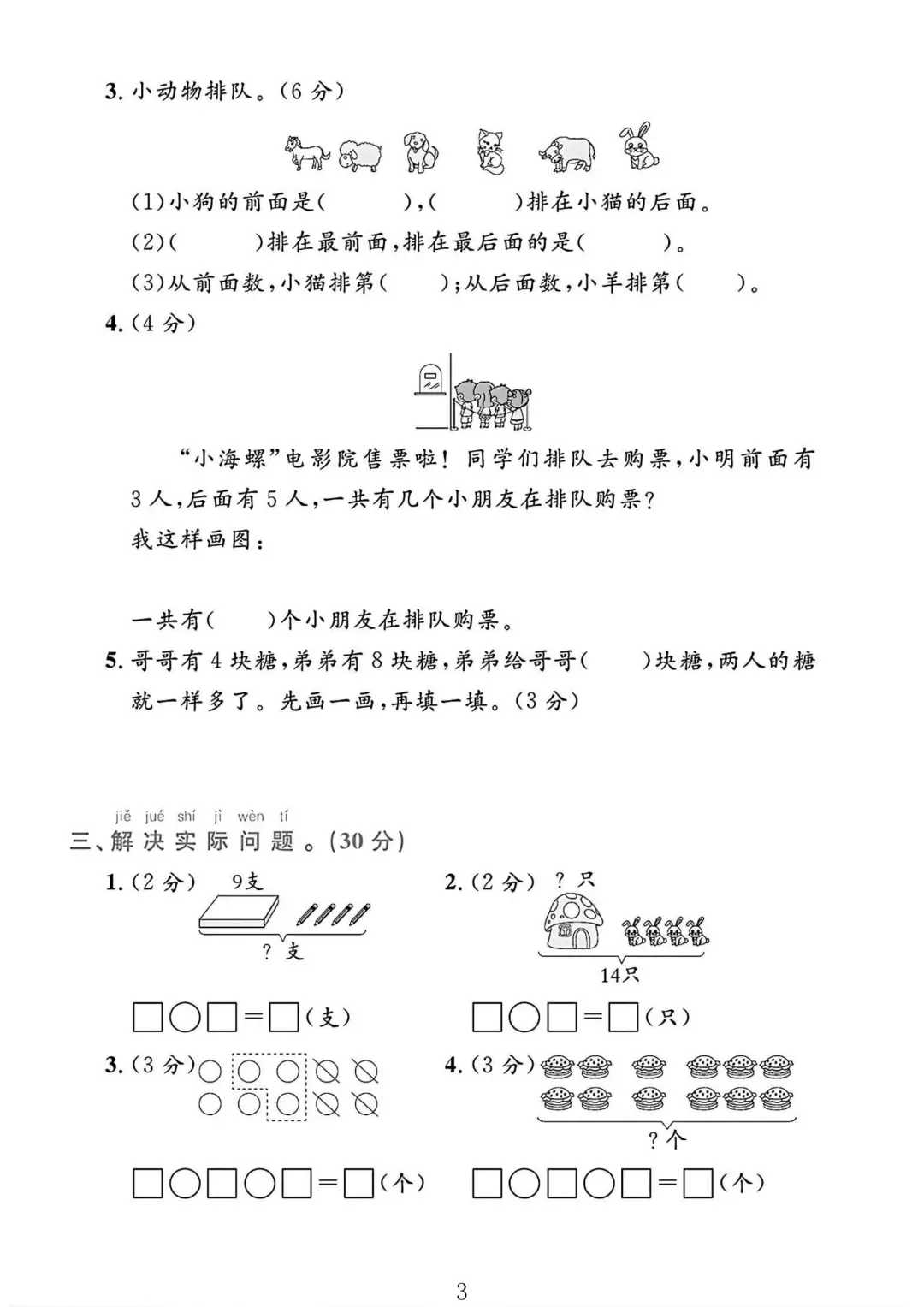青岛版数学 一年级上册数学 期末考试 期末 试卷 电子版可打印