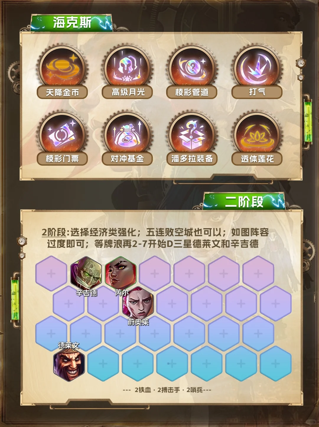 2️⃣阶段:选择经济类强化!优先存经济上人口!只留体系内的牌!德莱文搭配辛吉德和芮尔的组合