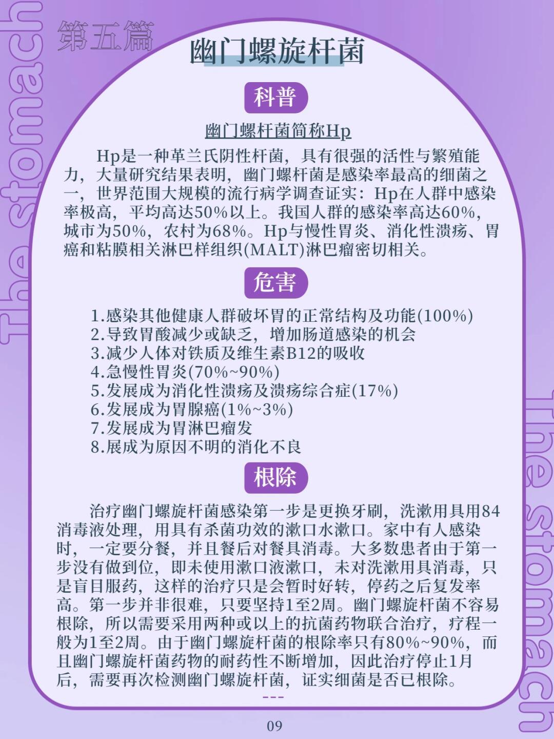 幽门螺杆菌是感染率最高的细菌之一,具有很强的活性与繁殖能力,慢性胃炎、消化性溃疡、胃癌和粘膜相关淋巴样组织(MALT)淋巴瘤密切相关,幽门螺旋杆菌不容易根除,所以需要采用两种或以上的抗菌药物联合治疗,疗程一般为1至2周。