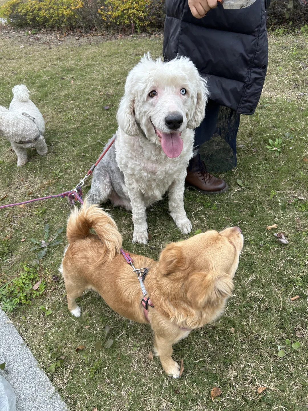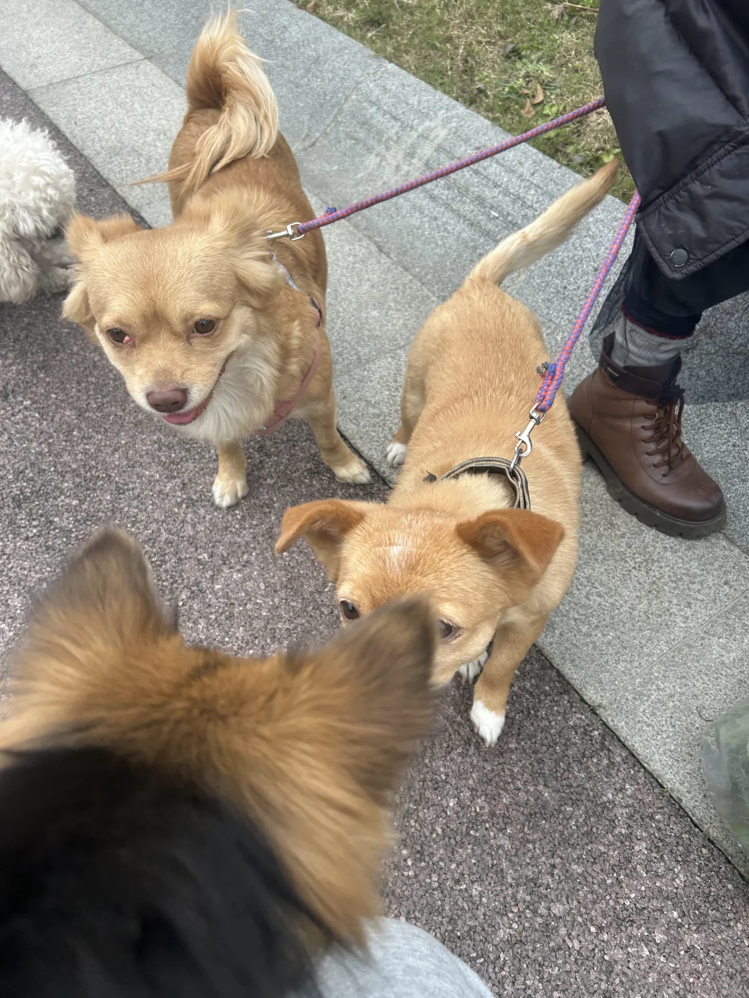 女友在散步的路上碰到了个同时溜四条狗的大姨。大姨给女友讲了一下自己的救助过程,大姨在郊区救过十六条狗,后来领养出去了,剩下的四条狗都是老弱病残领养不出去了,大姨就自己留着了。