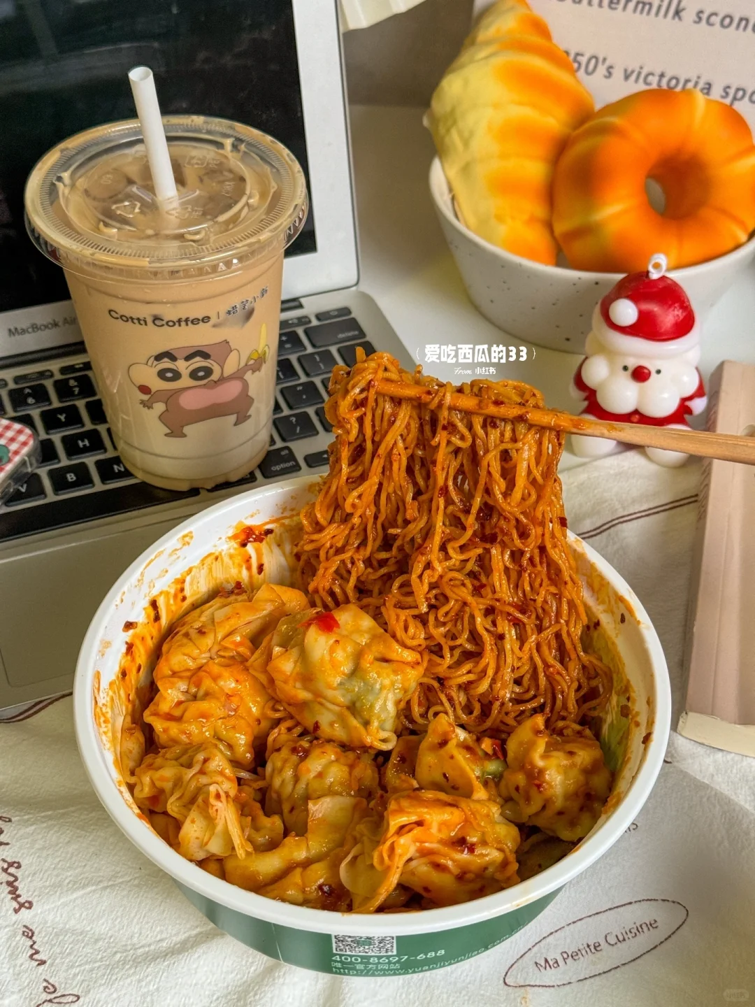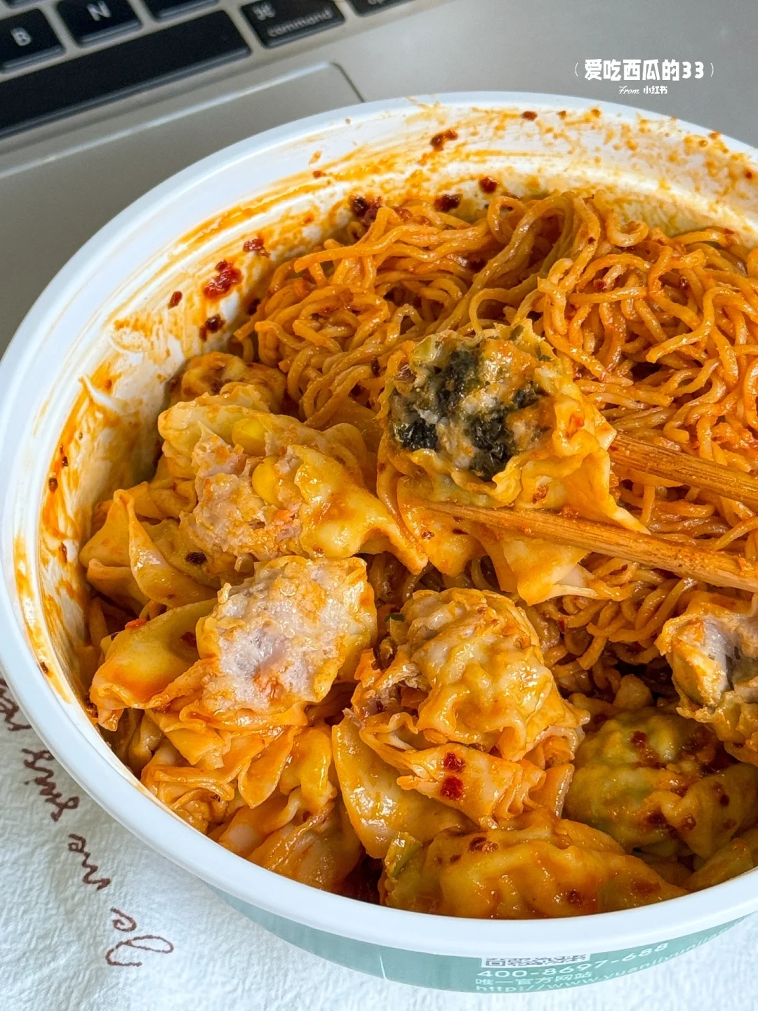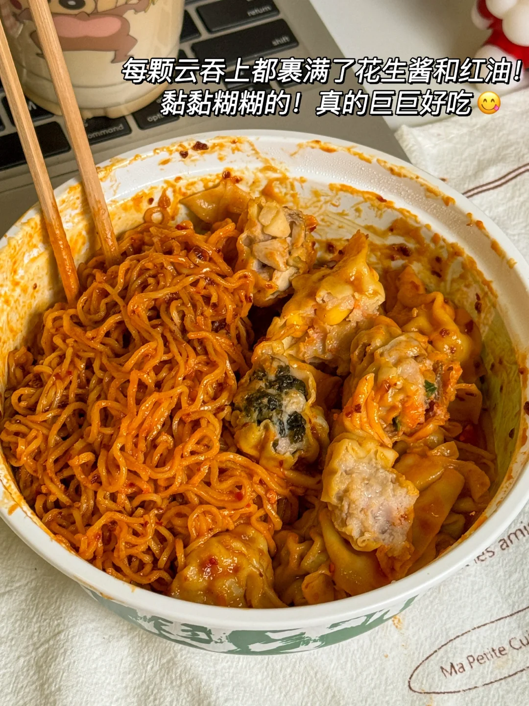 每颗云吞上都裹满了花生酱和红油!黏黏糊糊的!
