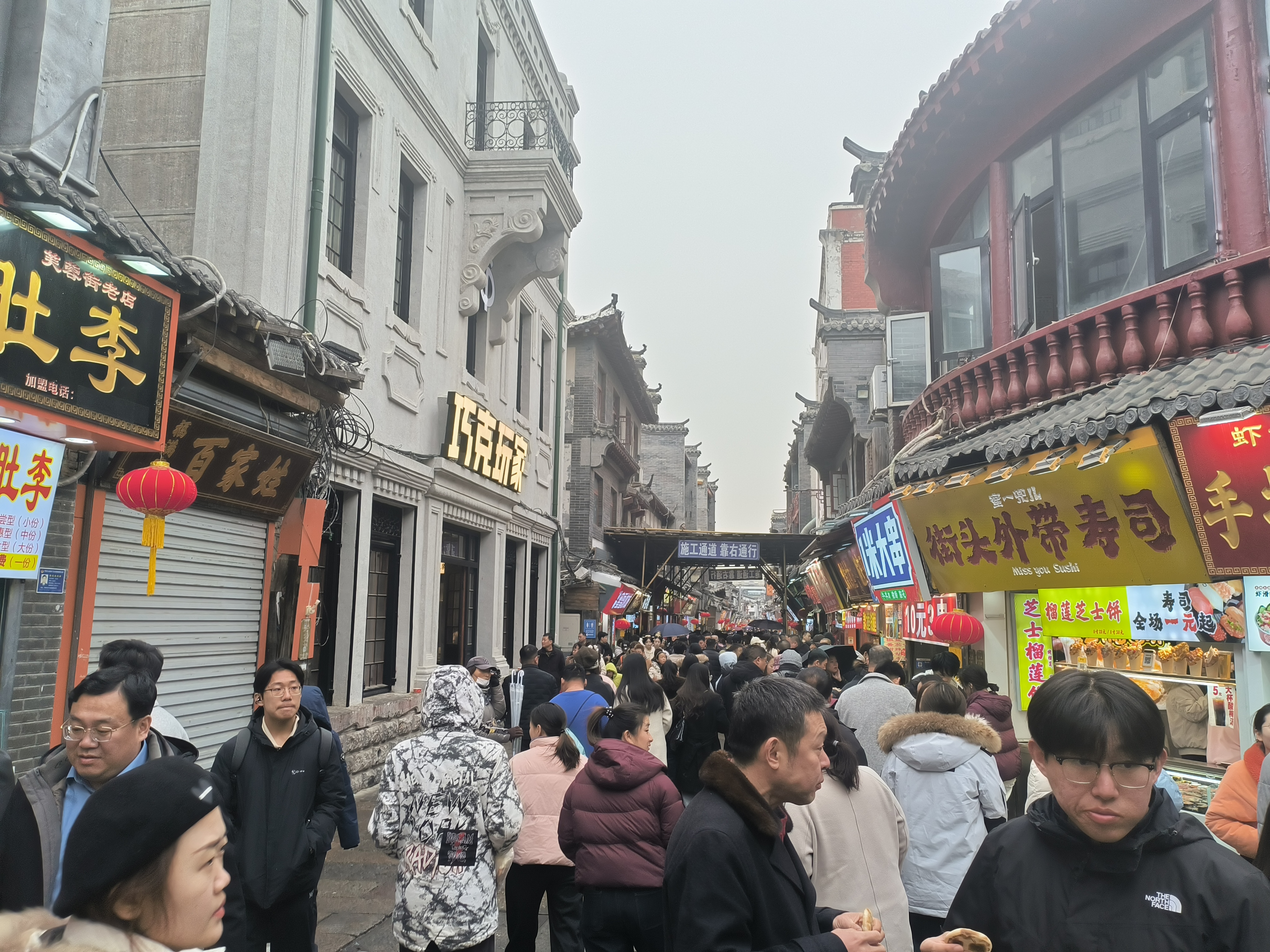 告别长辈后,我们漫步至省政府旁的芙蓉街。新春的细雨朦胧如烟,却丝毫未减老街的热闹,青石板路上摩肩接踵,车流熙攘,处处都是鲜活的烟火气。街边小吃琳琅满目,特色好物令人目不暇接,恒隆广场、苏宁电器、雅格西装等商铺林立,古韵与新潮交融,尽显2026年泉城的新气象、新景象、新亮点。行走其间,新春的美好与城市的蓬勃生机,一同镌刻在心底。