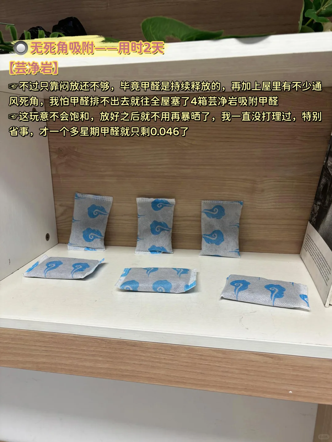☞不过只靠闷放还不够,毕竟甲醛是持续释放的,再加上屋里有不少通风死角,我怕甲醛排不出去就往全屋塞了4箱芸净岩吸附甲醛