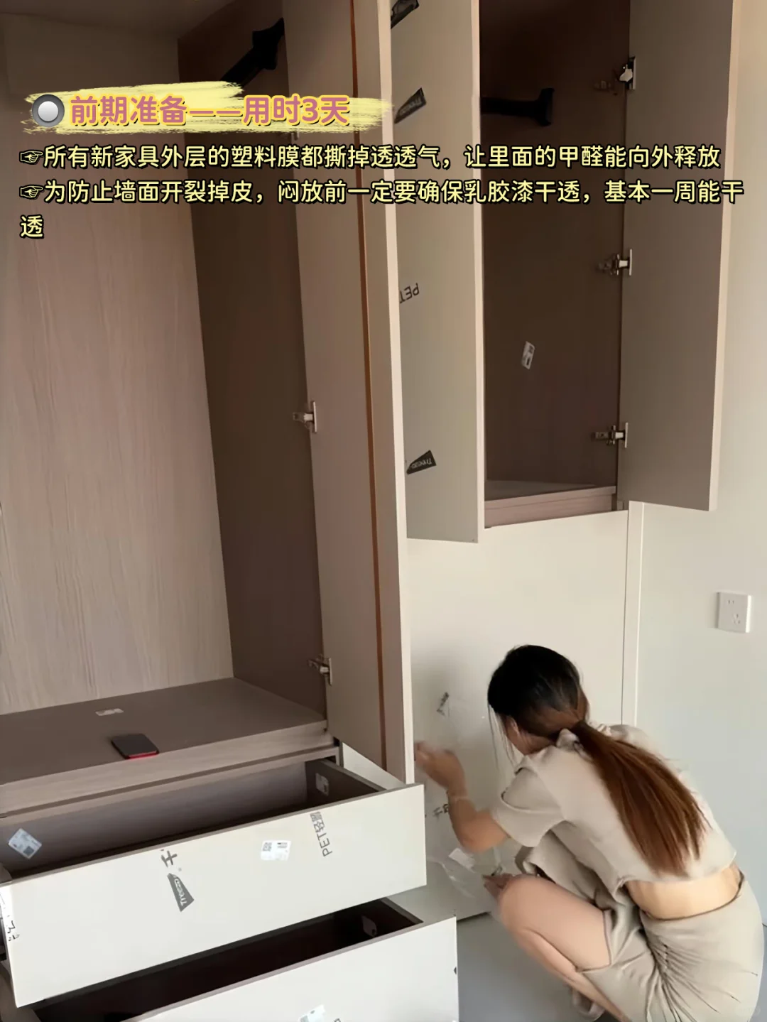 ☞闷完我再打开所有的门窗、柜门和风扇💨把甲醛快速排走,注意风扇得对着窗外吹