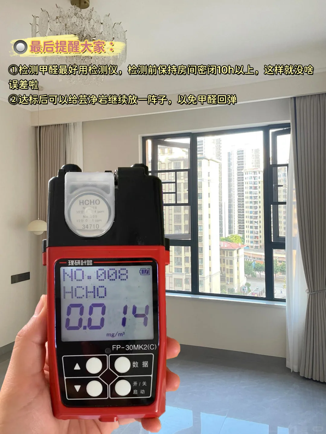 ①检测甲醛最好用检测仪,检测前保持房间密闭10h以上,这样就没啥误差啦