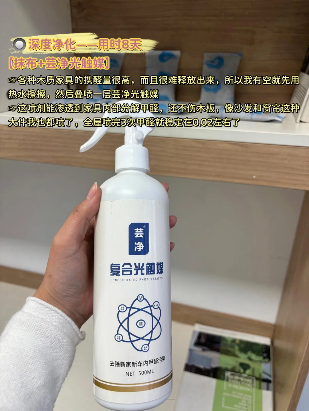 ☞这喷剂能渗透到家具内部分解甲醛,还不伤木板,像沙发和窗帘这种大件我也都喷了,全屋喷完3次甲醛就稳定在0.02左右了