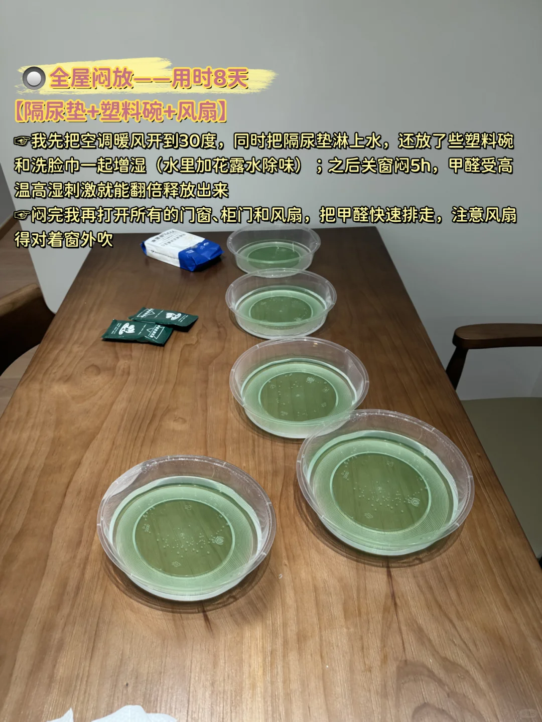 ☞我先把空调暖风开到30度,同时把隔尿垫淋上水,还放了些塑料碗和洗脸巾一起增湿💦(水里加花露水除味);之后关窗闷5h,甲醛受高温高湿刺激就能翻倍释放出来