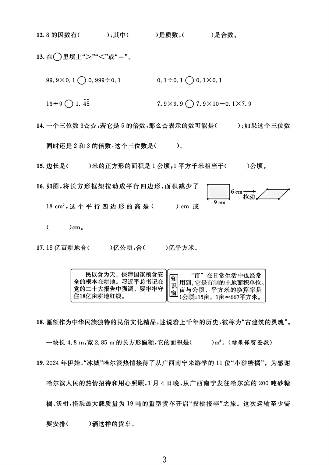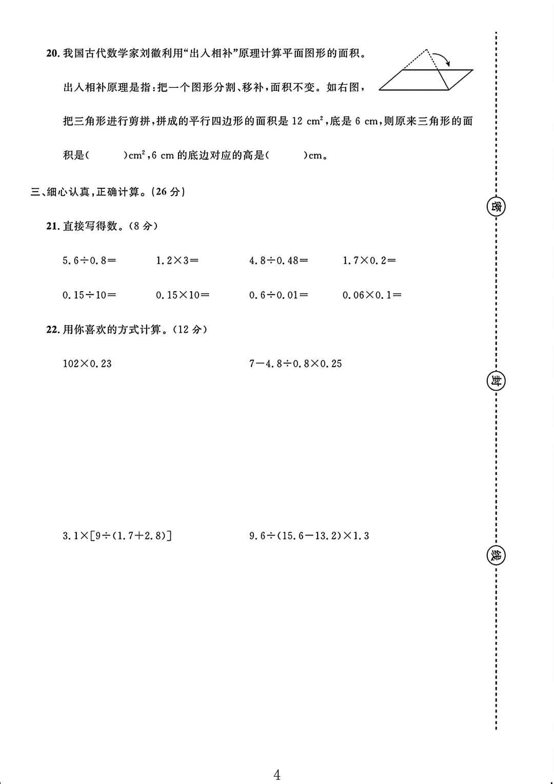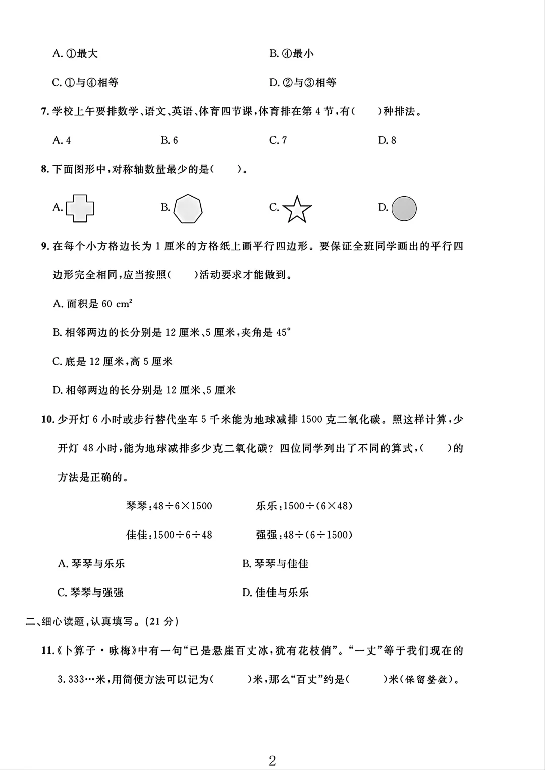 青岛版数学 五年级上册数学 期末考试 期末 试卷 电子版可打印