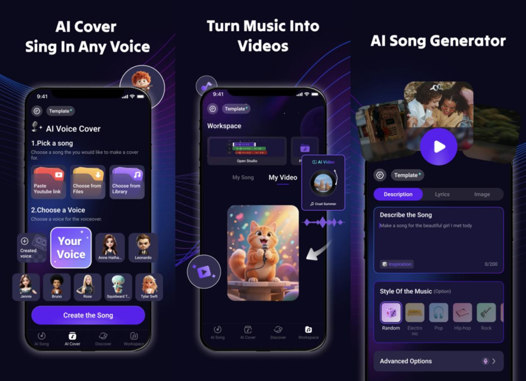 在AI功能架构上,Rythmix主要涵盖三大核心模块:AI歌曲创作、AI翻唱,以及AI视频生成。