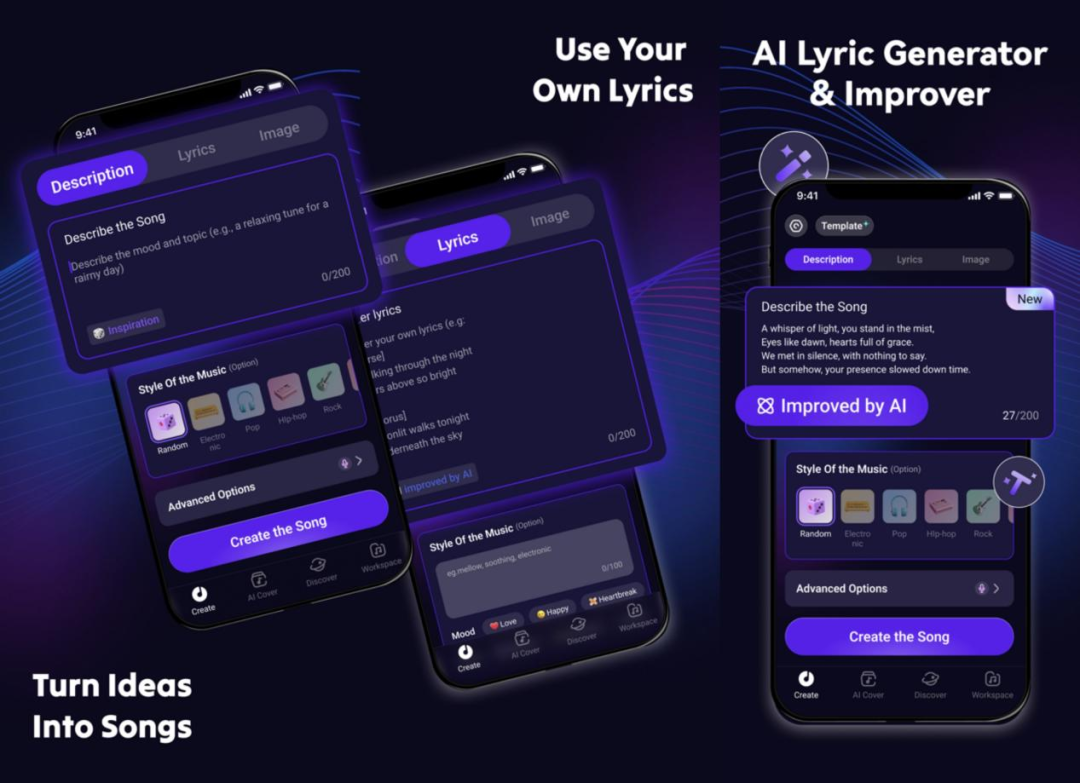 AI歌曲创作融合了文生曲与图生曲两大技术,用户只需用不超过300字的文字描述表达创意,即可一键生成音乐,过程中还可随时调整流行、摇滚、说唱等曲风,或交由AI随机发挥。在图片生成模式下,AI会识别并分析图像内容,自动生成与之风格匹配的歌曲,使音乐旋律与图片所传达的意境高度契合。