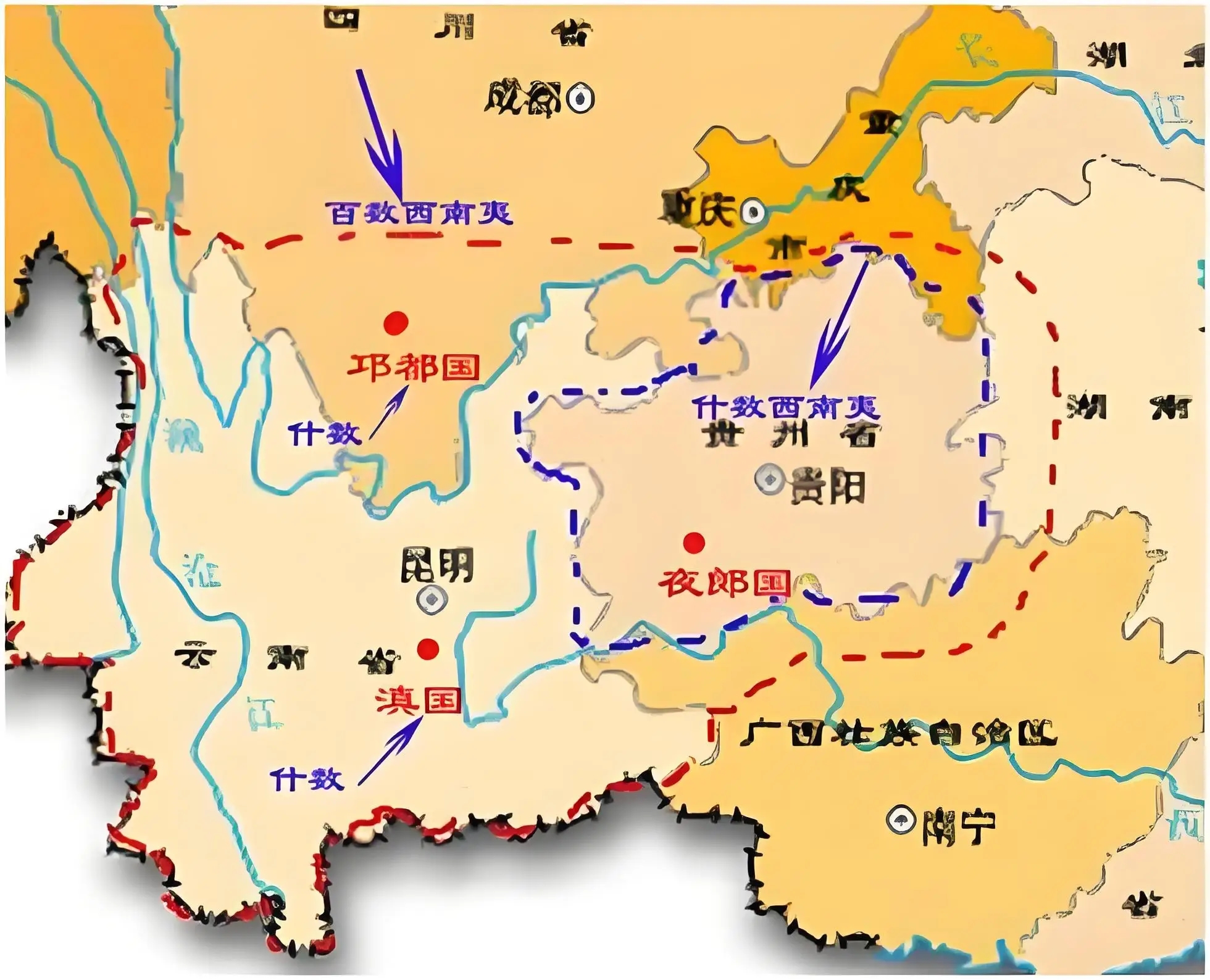汉武帝采纳了这一建议任命唐蒙为中郎将率领千余名士兵与万余名负粮民夫从巴郡符关深入南夷开启了探索与开拓的征程。彼时汉朝西南居住着夜郎(今贵州西南部)、滇(今云南昆明)、邛都(今西昌地区)、冉驰(今四川茂汶羌族自治县)等众多少数民族部落。这些部落彼此割据与中原隔阂已久。唐蒙率军首先抵达夜郎。夜郎侯多同自认为是西南夷中实力最强者竟提出了夜郎与汉朝比谁大谁小的问题——这给后世留下了一个“夜郎自大”的典故。唐蒙一面向夜郎侯多同展现汉朝的强盛国力,又以丰厚赏赐示好,更陈明归附后的长远益处。