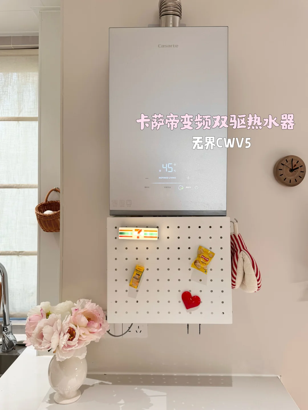 我家是开放式厨房,加上家里分布多个用水点,所以燃气热水器首选体积小,颜值高并且大水量还恒温的~考虑到这些,改造厨房时换了一台卡萨帝变频双驱热水器·无界VWV5
