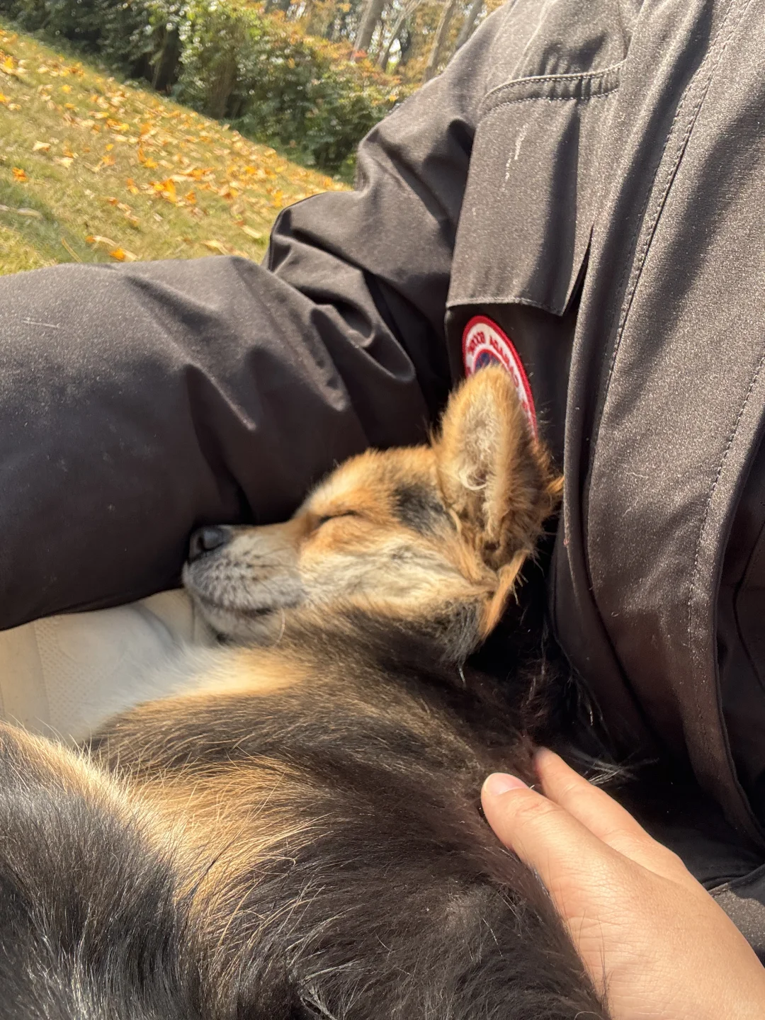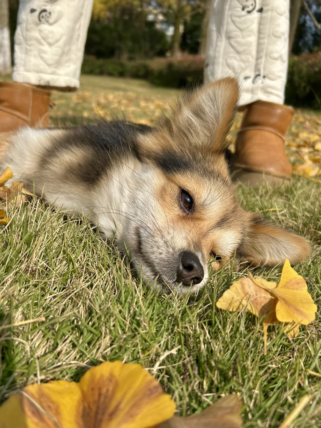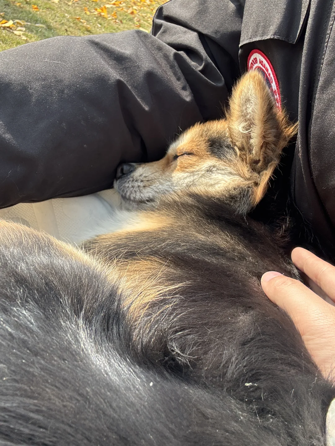 找了一处没人又干燥的草坪我和女友坐下了,小黑立刻从不远处飞奔来躺在了我腿上,把头靠在我胳膊窝里(图3-4),在上半身躺下后,小黑用力一蹬把腿放在了女友身上,躺在我们两个的腿上伸懒腰,他要同时占有两个人的怀抱[笑哭R]