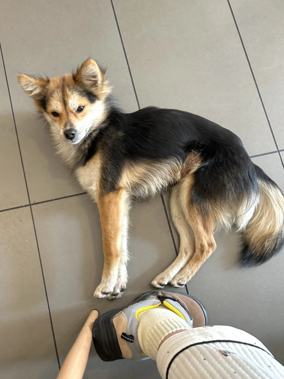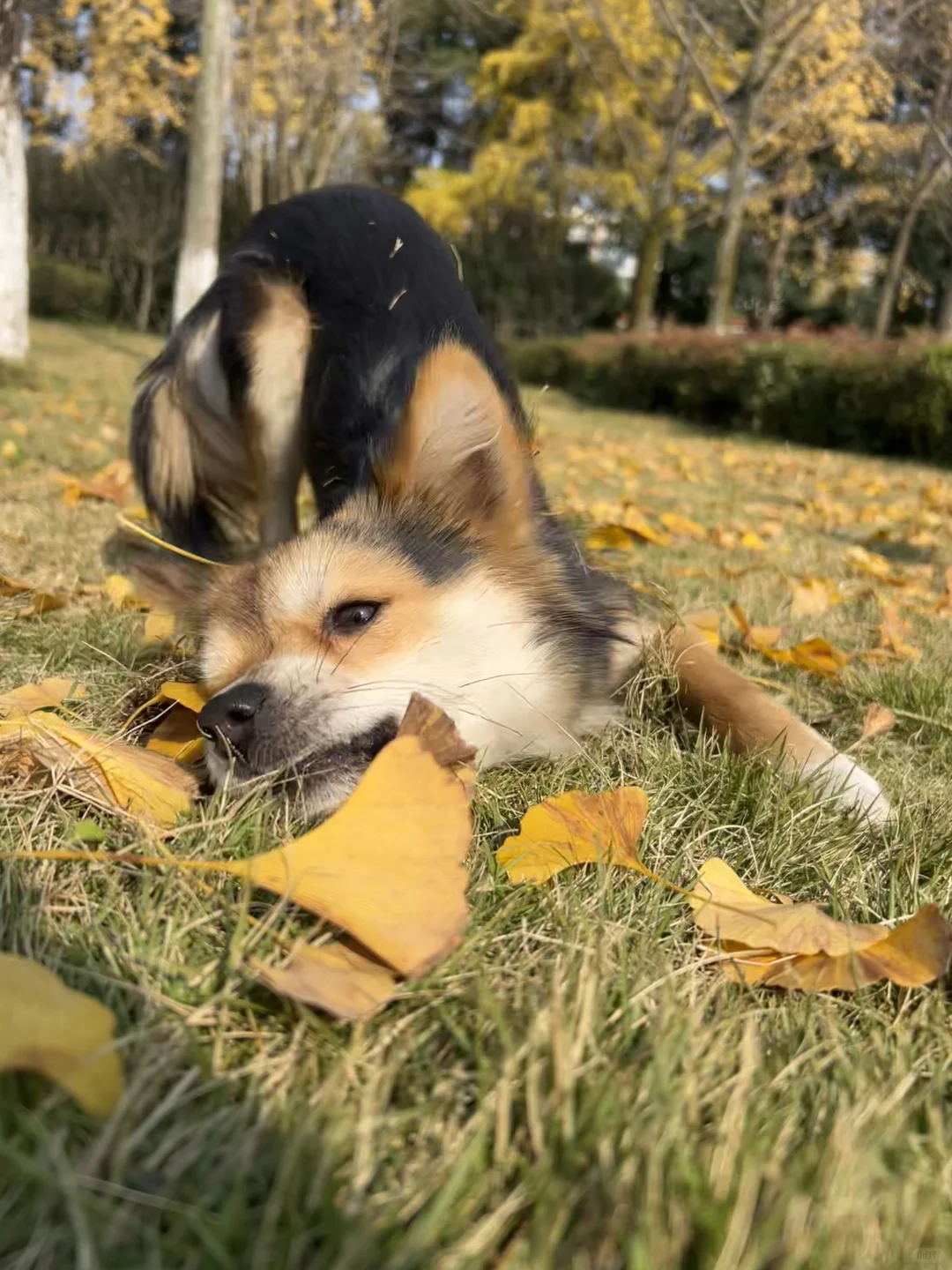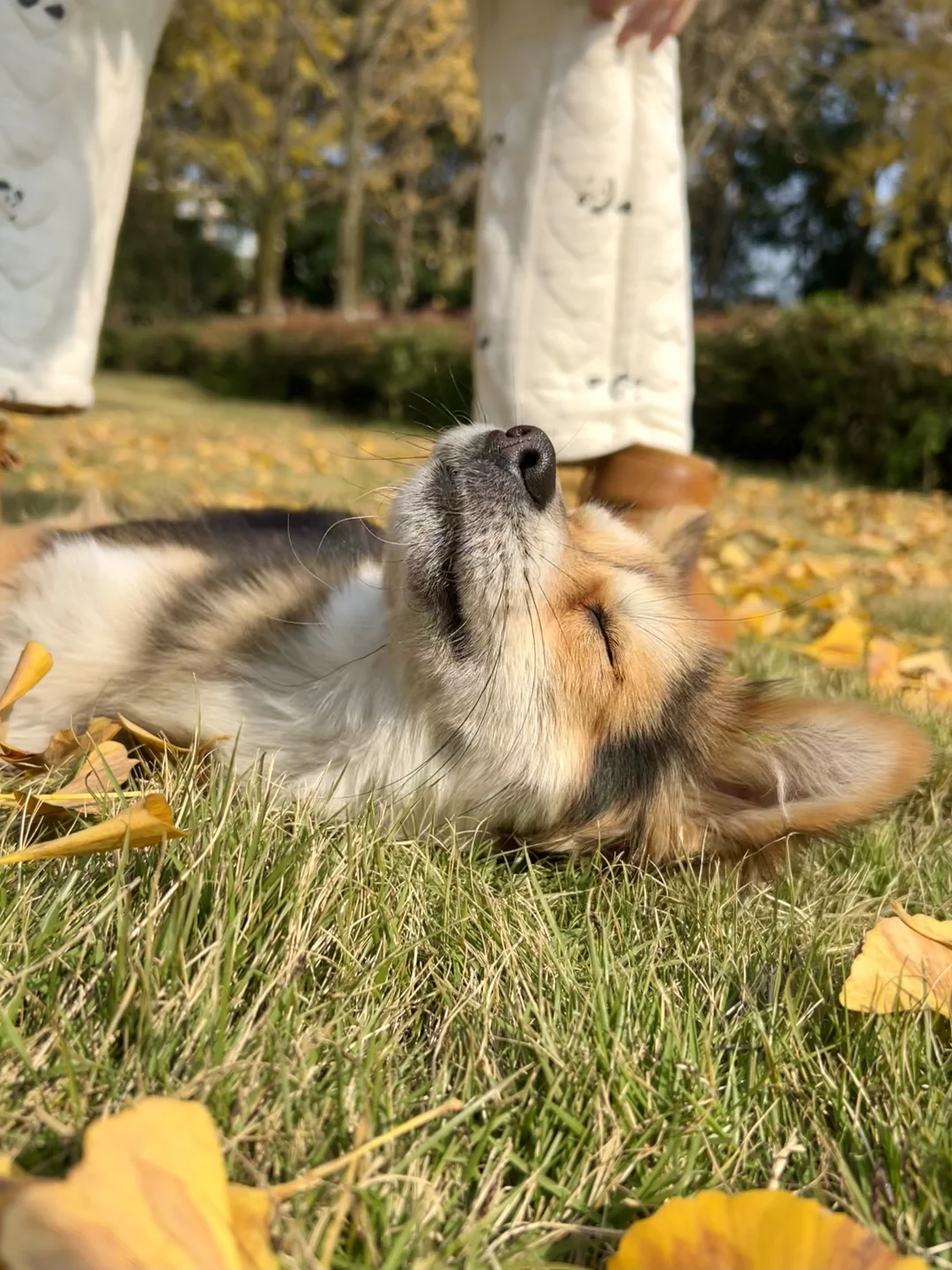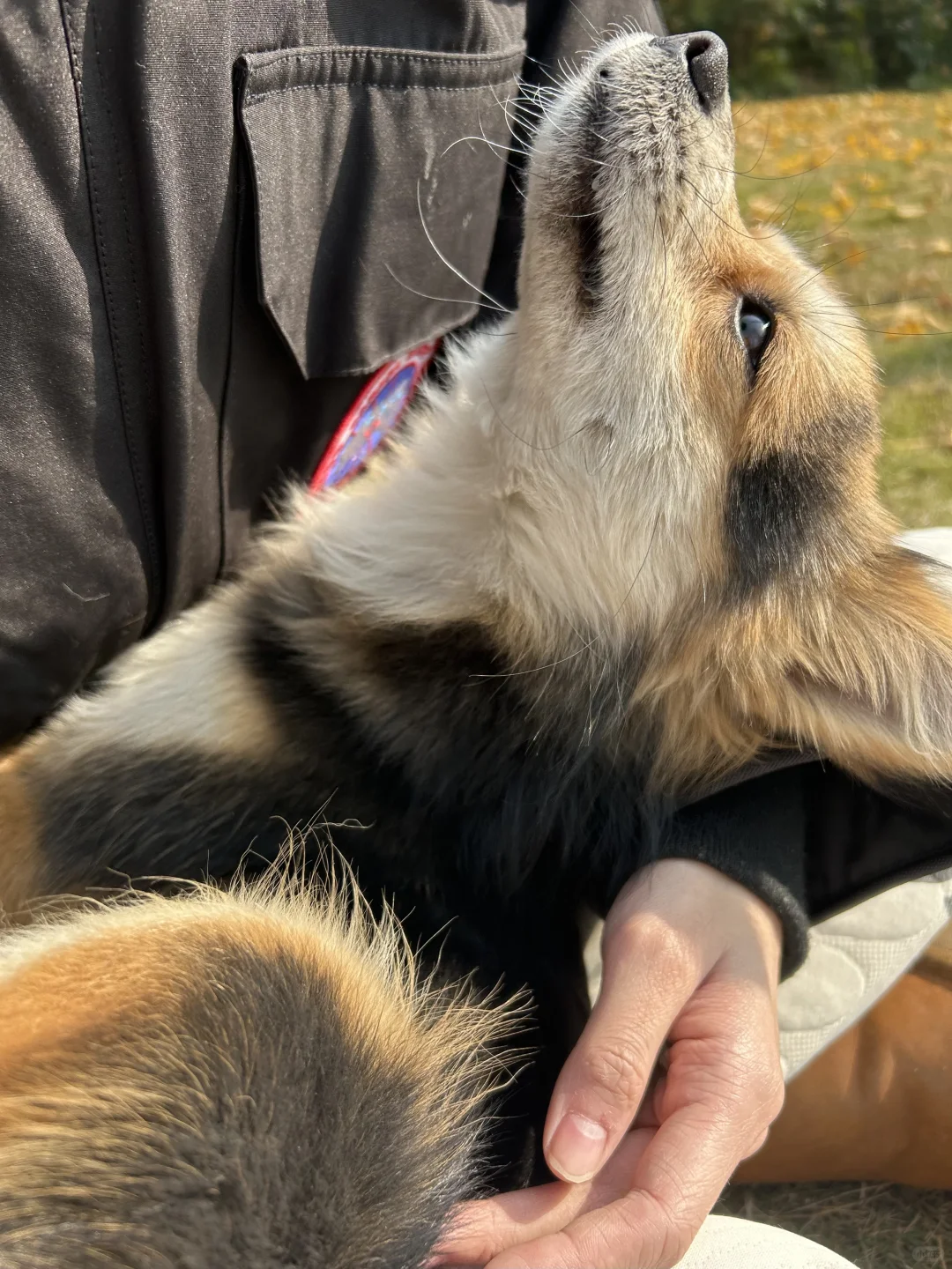 找了一处没人又干燥的草坪我和女友坐下了,小黑立刻从不远处飞奔来躺在了我腿上,把头靠在我胳膊窝里(图3-4),在上半身躺下后,小黑用力一蹬把腿放在了女友身上,躺在我们两个的腿上伸懒腰,他要同时占有两个人的怀抱[笑哭R]