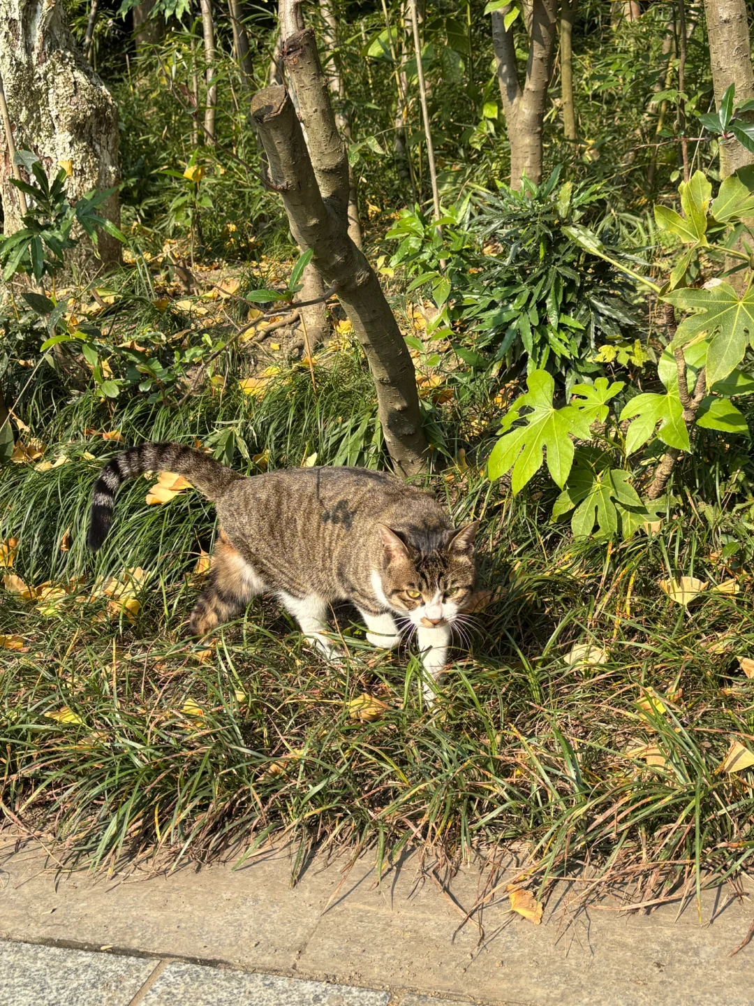 我们在公园里发现了一只美丽的花瓣嘴大狸猫(图13),我们刚想摸一下这只大狸花,小黑就从远处飞奔而来呜呜这个大狸猫。大狸猫不甘示弱,浑身的毛发都炸了起来,最后小黑败下阵来跟着我们走了。