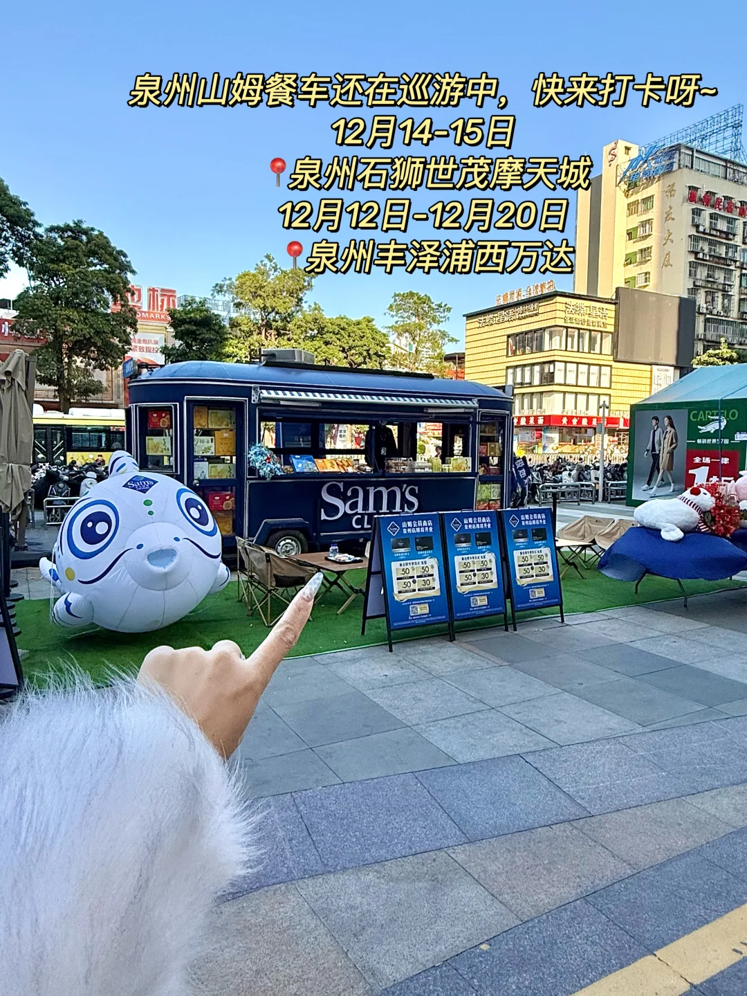 啊啊啊啊泉州终于也有山姆了! 月底就要开业啦!还很贴心地为泉州人民提前安排上了试吃🤣 山姆餐车活动现场巨巨多种美食试吃,大厨切的一点也不手软!直接被投喂饱了!! 没想到外出的餐车食物品质也保持得那么好,品质都是可以明显吃得出来的……我真的爱惨山姆啦!!! · ✔️ MM焦糖饼干千层 谁懂啊!我一个不爱焦糖的都觉得很美味😭😭没有过分甜腻,薄脆片和焦糖果味酱完美结合!夹心的饼干碎和谷物粒,层次口感贼丰富! ✔️ MM原味伯爵瑞士卷 有没有像我一样瑞士卷爱吃伯爵口味的!绵密松软,内陷的奶油和茶香恰到好处!!根本吃不腻好吧😋 ✔️ MM原味麻薯 俺每次去山姆都会买两三盒麻薯!嚼起来又香又有韧劲!越吃越上头…… ✔️ MM榴莲岩烧芝士包 榴莲脑袋都给我去吃😭😭😭内陷真的有榴莲果肉!!混合着新西兰进口奶油芝士,奶香味榴莲、一口爱上! ✔️ MM低糖蛋黄酥 蛋黄酥星人福音啊!雪媚娘糯糯的,里面超大颗蛋黄!还是低糖的😍😍绝了呜呜呜,太懂我们女生的心 ✔️ MM澳洲谷饲西冷薄切牛排 牛排是看着大厨现场煎的,偷了一波师,七分熟也太好吃了!外脆里嫩的口感,每一口都是肉汁!!真的超满足😭 ✔️MM生冷冻南美白对虾 这虾真!的!超!级!大!肉质紧实又Q弹,水煮、虾滑、蒸粉啥的都hin方便!!我感觉我的减脂餐有救了 ✔️ MM小青柠汁饮料 打开就能闻到清新的青柠香🍋!酸酸甜甜、炒鸡清爽的!!每次去山姆都能看到人手一提。。 ✔️ 三方四季 雪梨枇杷露 听说这是山姆新品,口口都是雪梨的清甜!喝完感觉嗓子都润润的🤤🤤尊嘟很适合冬天哎~ · 除此之外,现场还有滴水兽锦鲤气模和山姆特色簪花可以拍照打卡,配合着泉州的好天气好出片!发朋友圈都在评论问我这是哪里 · 山姆餐车地址📍:泉州浦西万达广场1号门正对门餐车