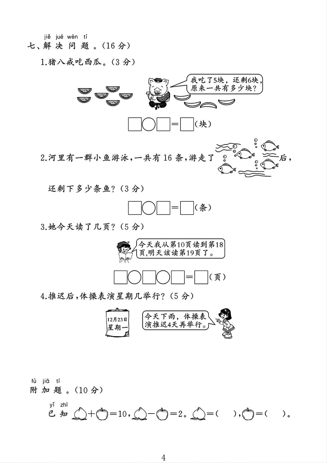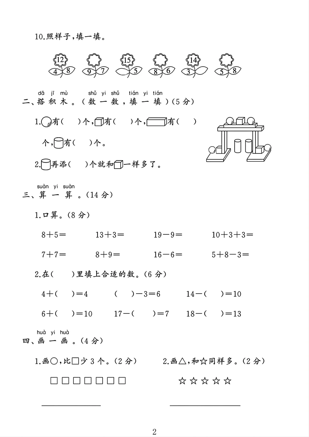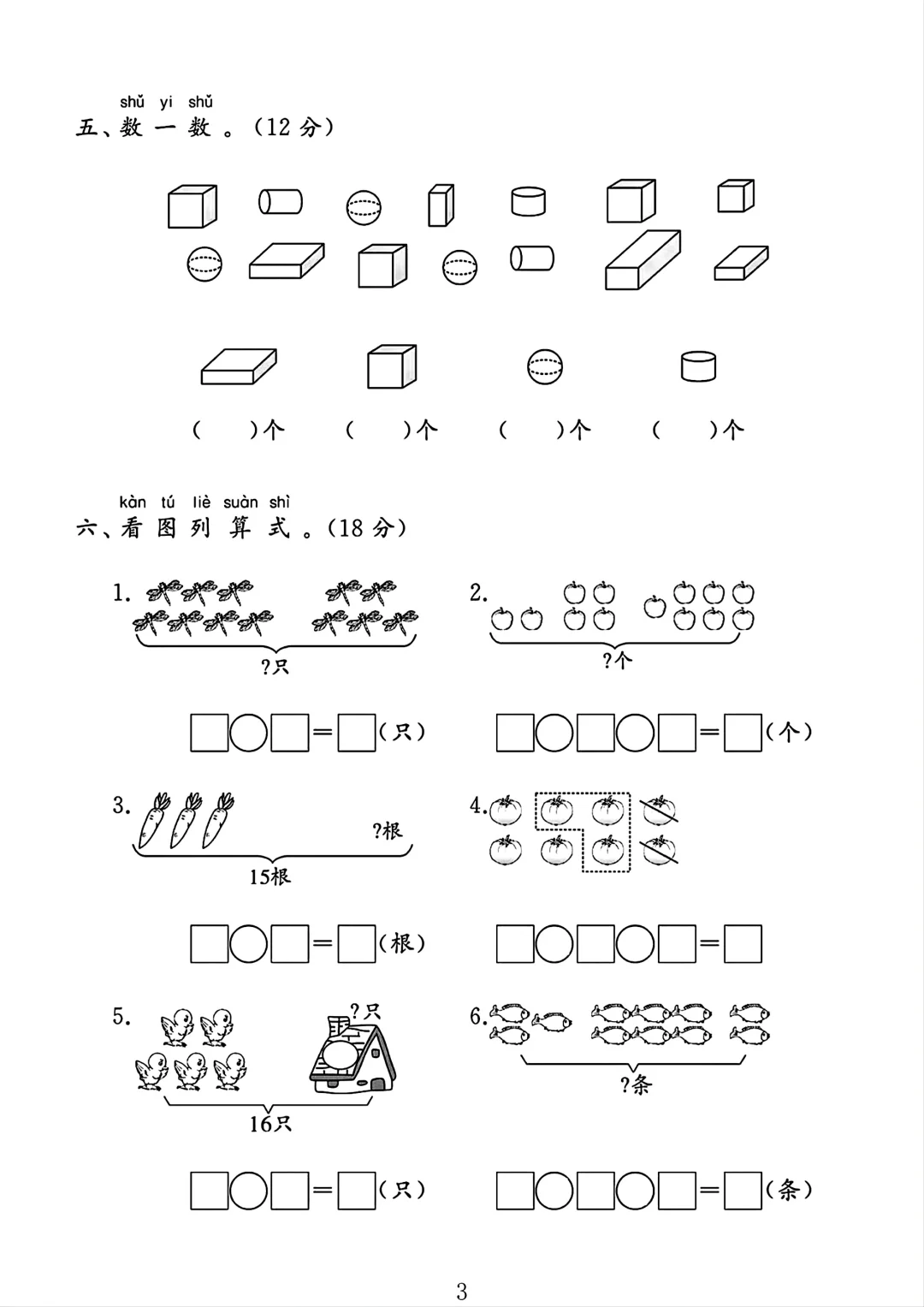人教版 一年级上册数学 期末试卷 期末考试 电子版可打印