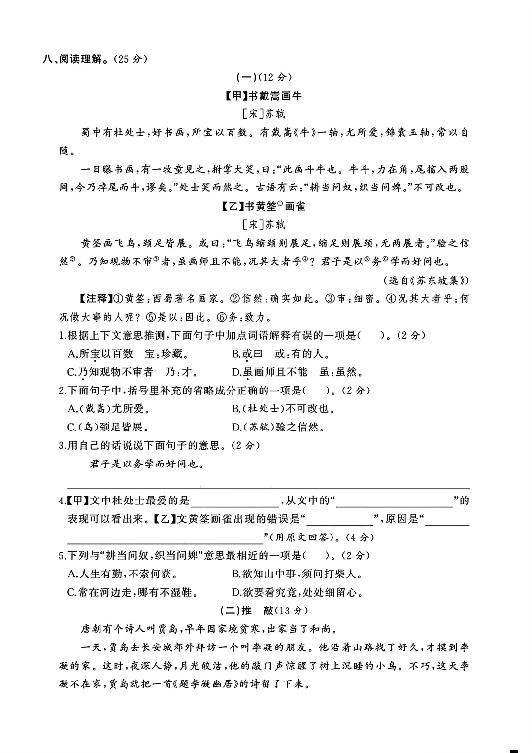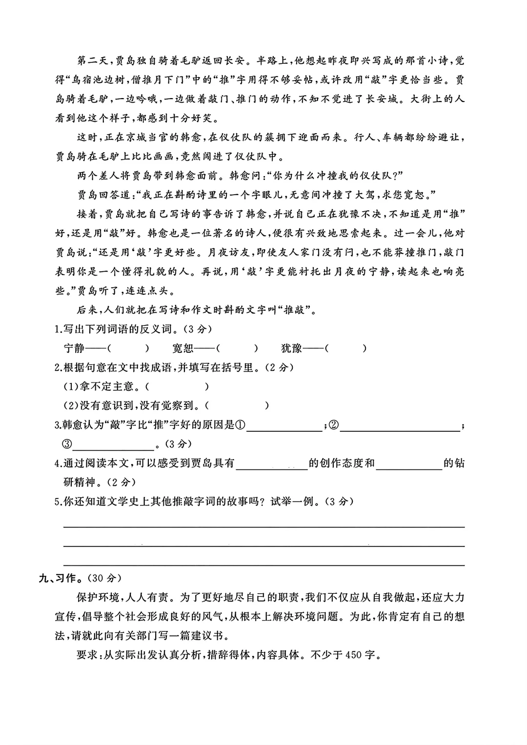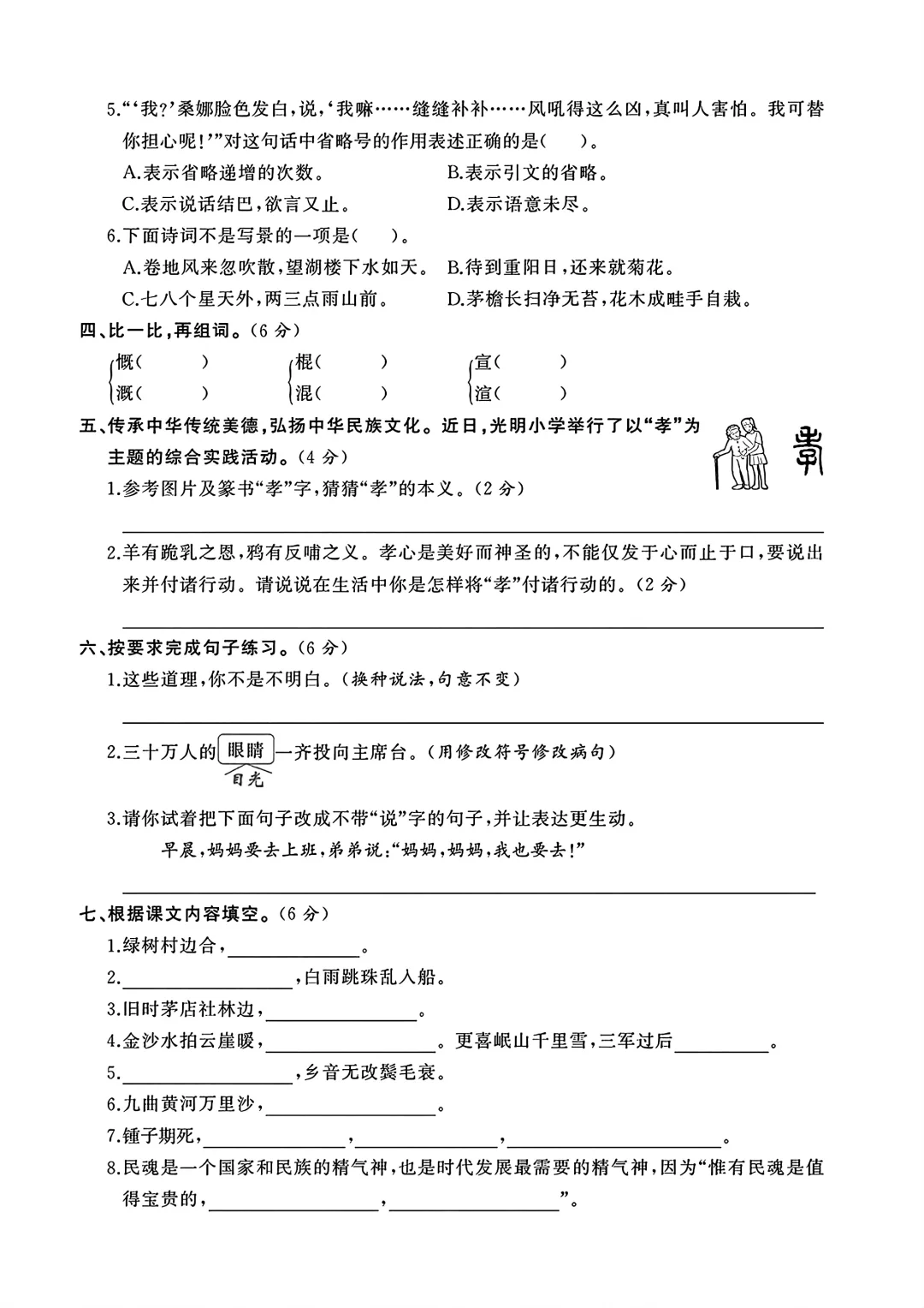 人教版 六年级上册语文 期末考试 期末 试卷 电子版可打印