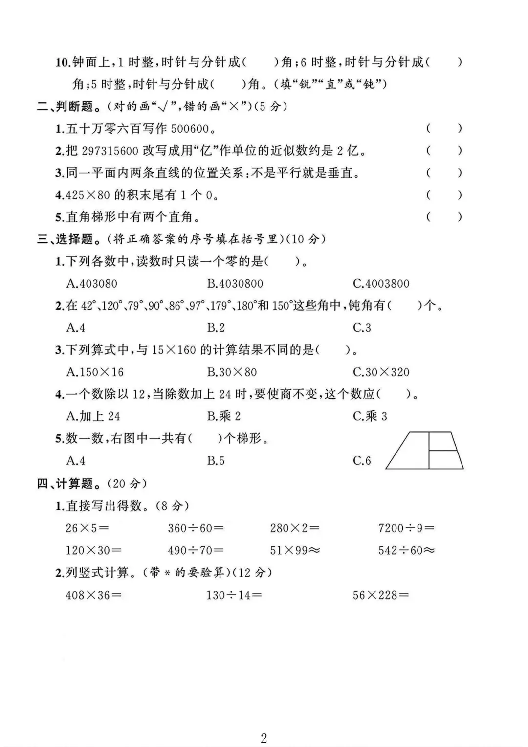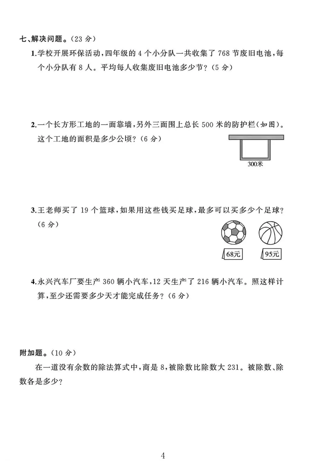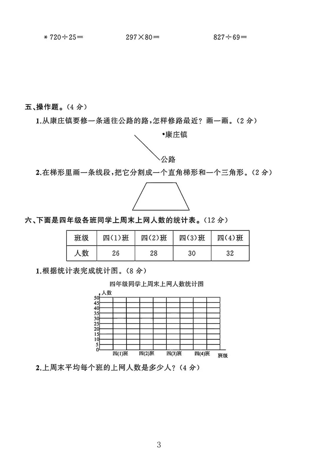 人教版 四年级上册数学 期末考试 期末 试卷 电子版可打印