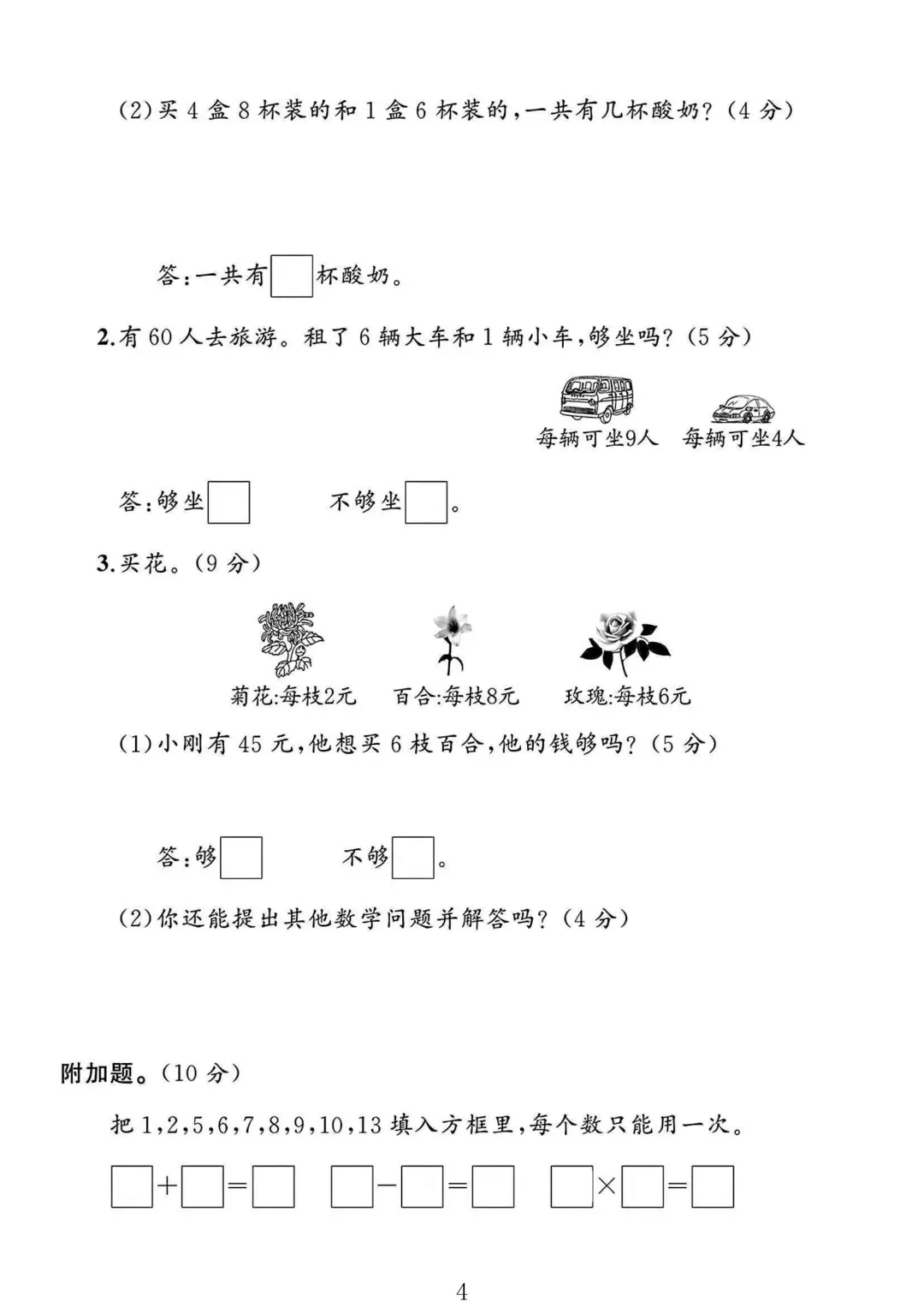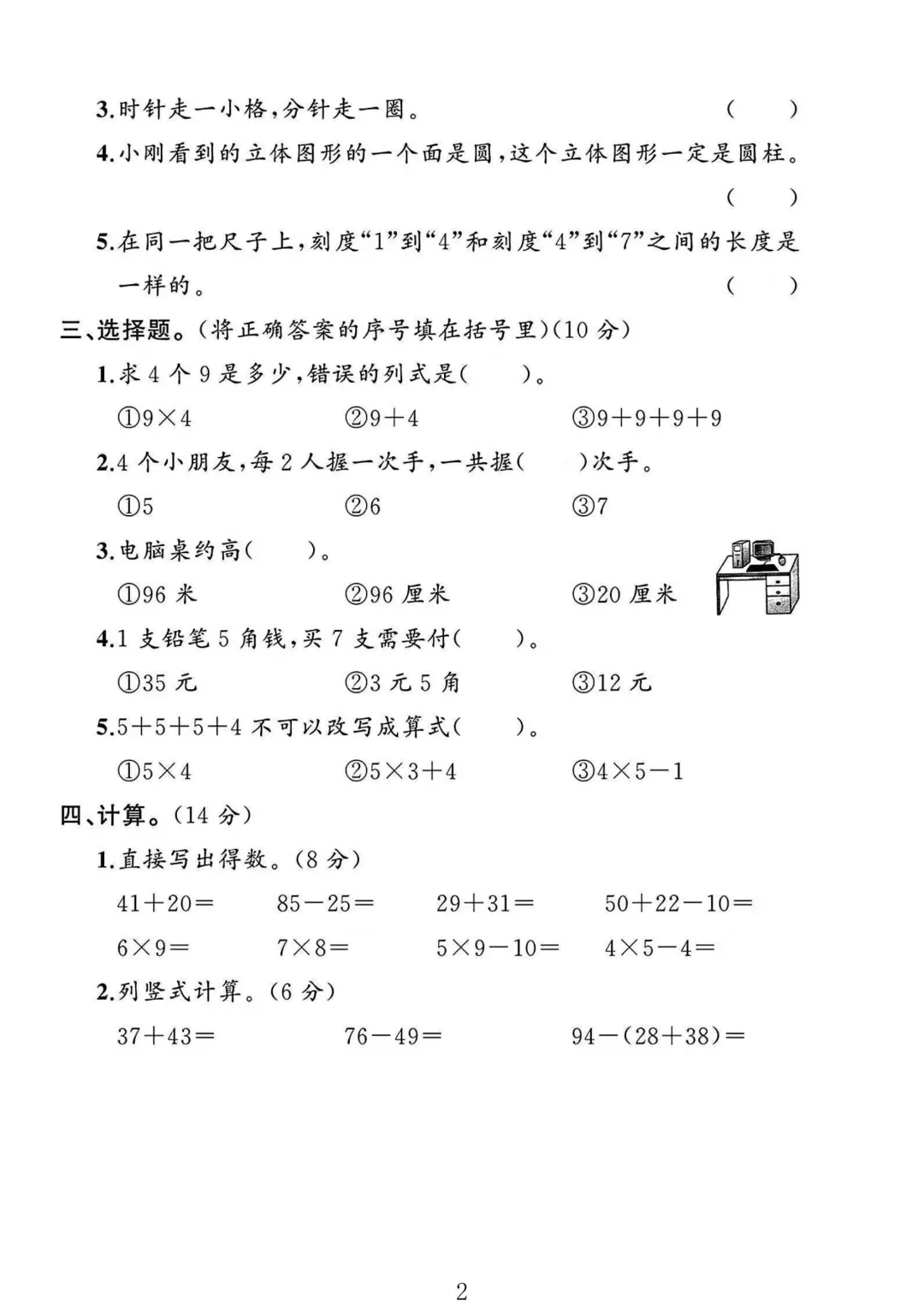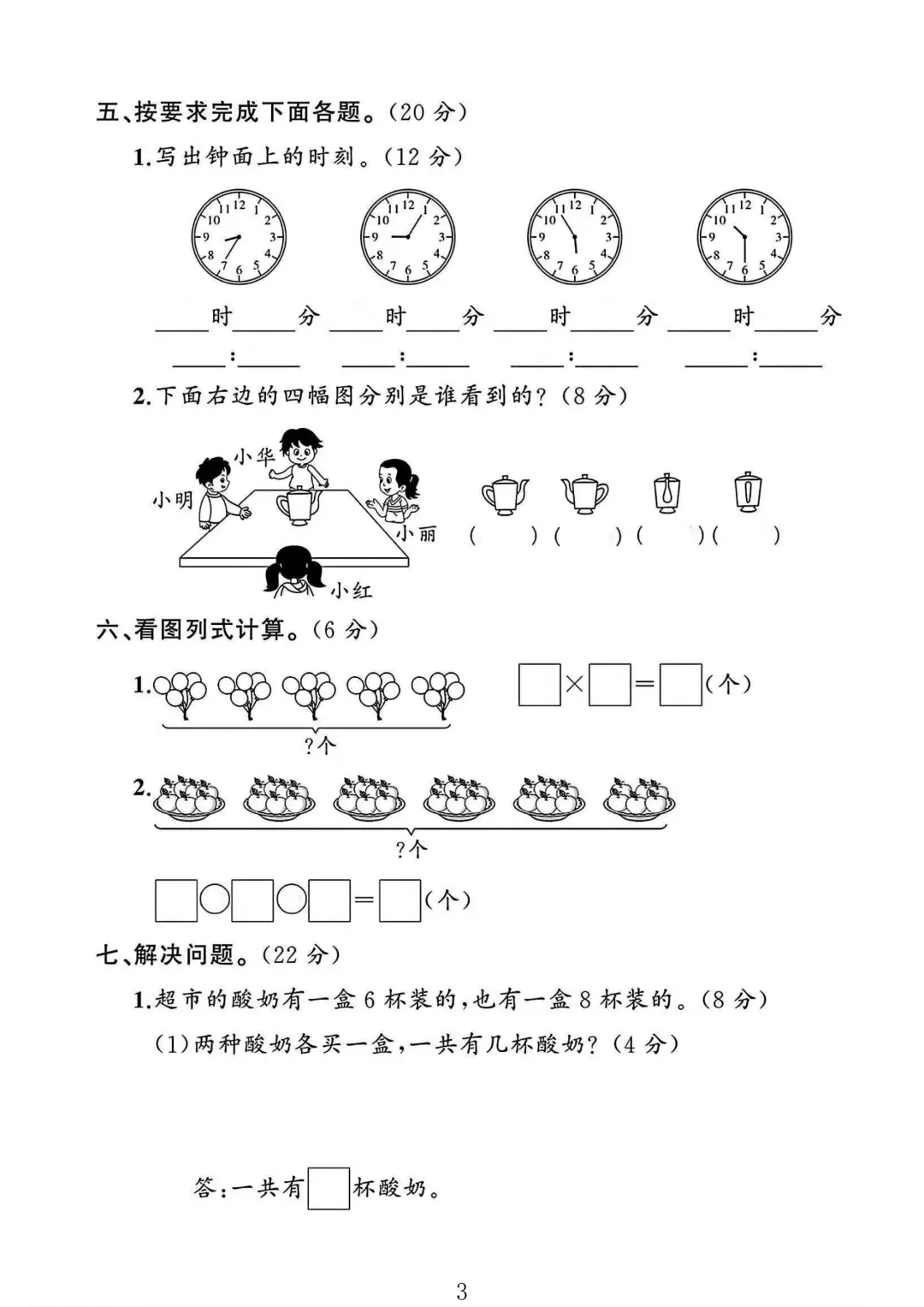 人教版 二年级上册数学 期末试卷 期末考试 电子版可打印