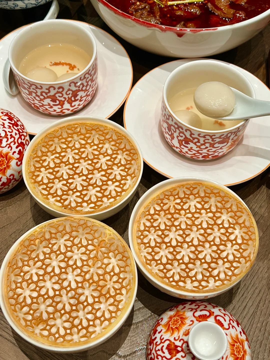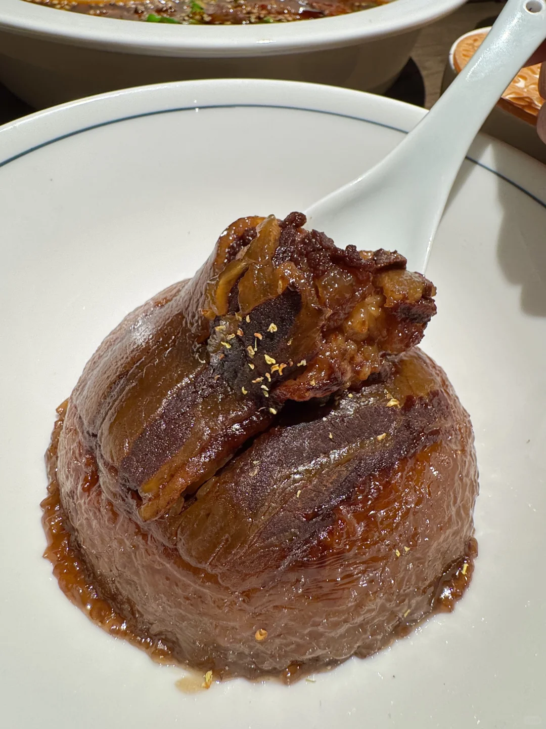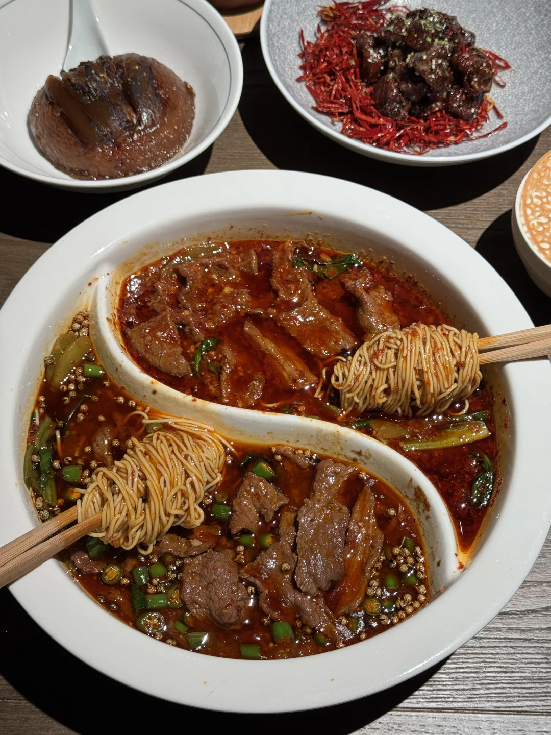 终于又吃到好吃的双味水煮黄牛肉了!两种不同口味的牛肉!肉质扎实有嚼劲 再来上一份面🍜香迷糊了啊!! ✔️甜烧白 第一次吃甜烧白 甜甜的糯米饭搭配薄薄的五花肉 香香甜甜的口感好喜欢❤️ ✔️馋嘴脑花 装在小猪🐷器皿里的脑花 kuku一顿炫米饭🍚! ✔️堂涮血旺 热气腾腾好适合这个天气吃!锅开后加入血旺黄鳝和火腿 毛肚直接涮着吃 辣辣的好上头! ✔️盖碗茶 餐后来上一份盖碗茶 淡淡的茶香很清新 干椒牛肉粒、牛肉萃饭、酸甜口的宫爆虾球🍤、酸奶碗…盲点都不踩雷!