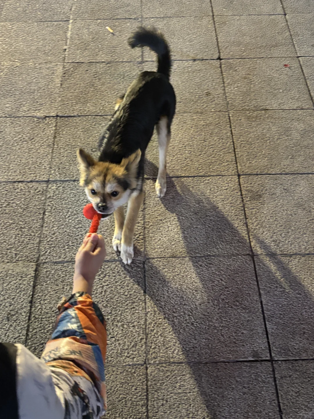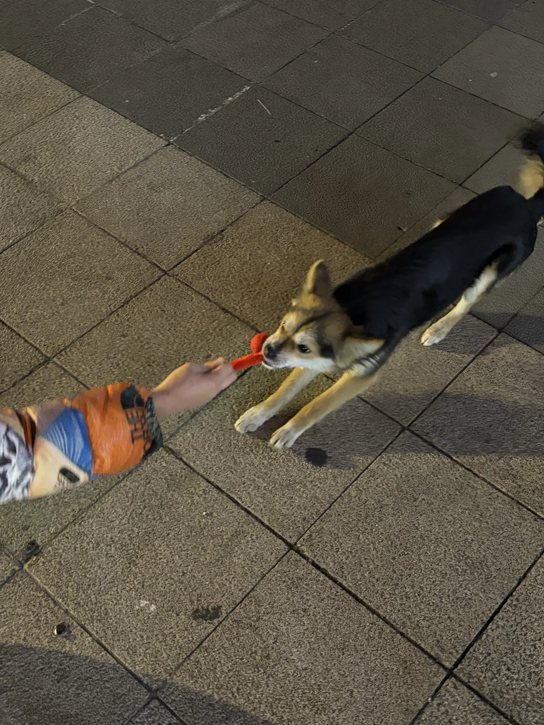 小黑闻了一下,要走,店员追着他,把肠掰开喂小黑,他闻了闻还是不吃,回到了外面继续玩玩具——一个红色泡沫球。在他眼里玩具比火腿肠有吸引力多了。