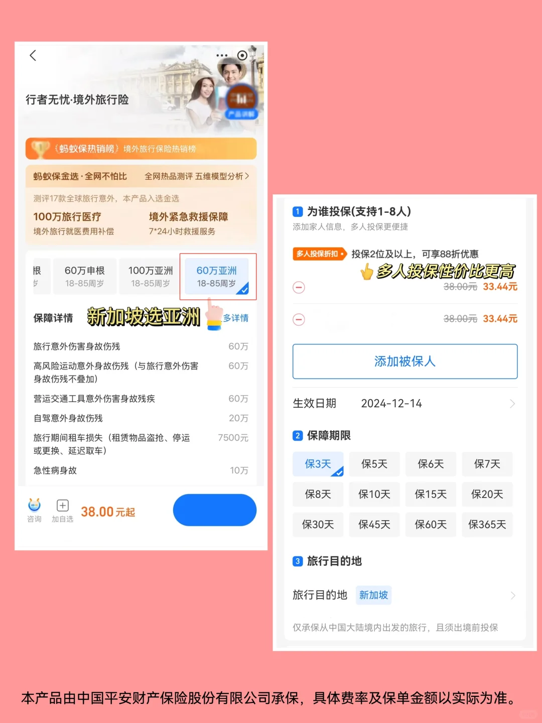 需要的朋友,直接支付宝🔍【行者无忧】就轻松找到,去新加坡选「亚洲60万版」保3天也只需要38块,旅程延误有1800元的保额,2人以上投保还有88折优惠,划算的~