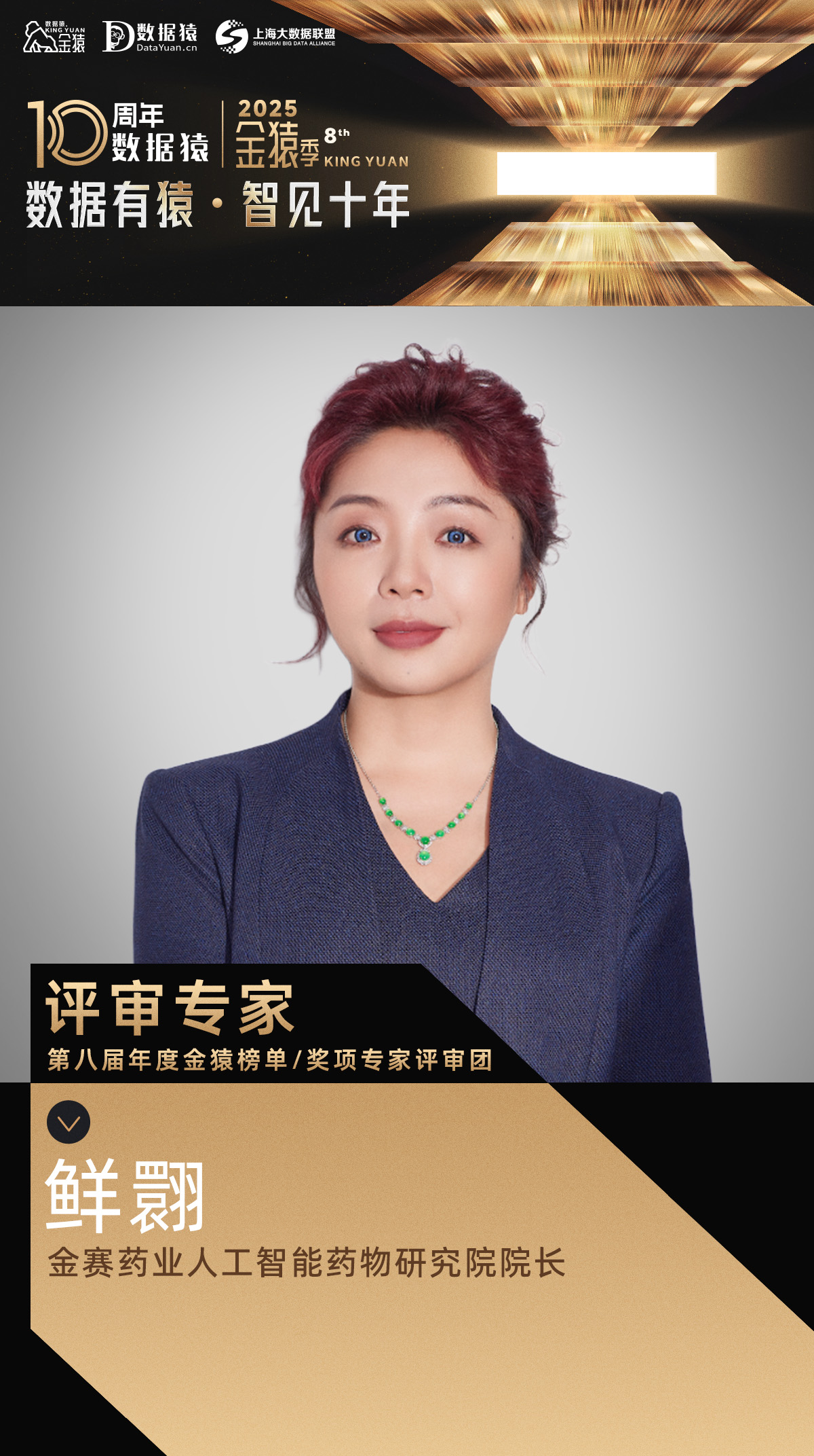 【终审团专家公告】金赛药业人工智能药物研究院院长鲜翾,已确认成为“2025第八届年度金猿”榜单/奖项评审团专家评委,并将授予评委荣誉证书。