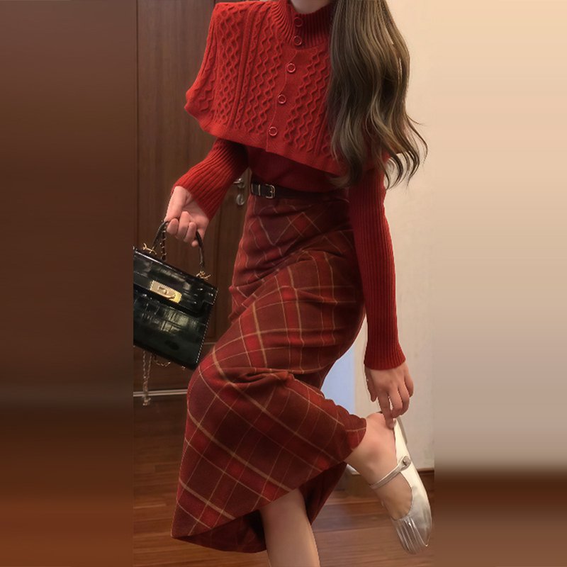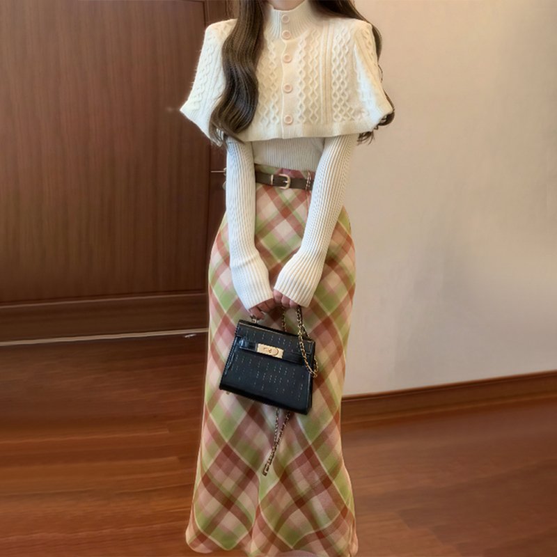 🍂秋季穿搭秘籍:斗篷毛衣+格纹半身裙