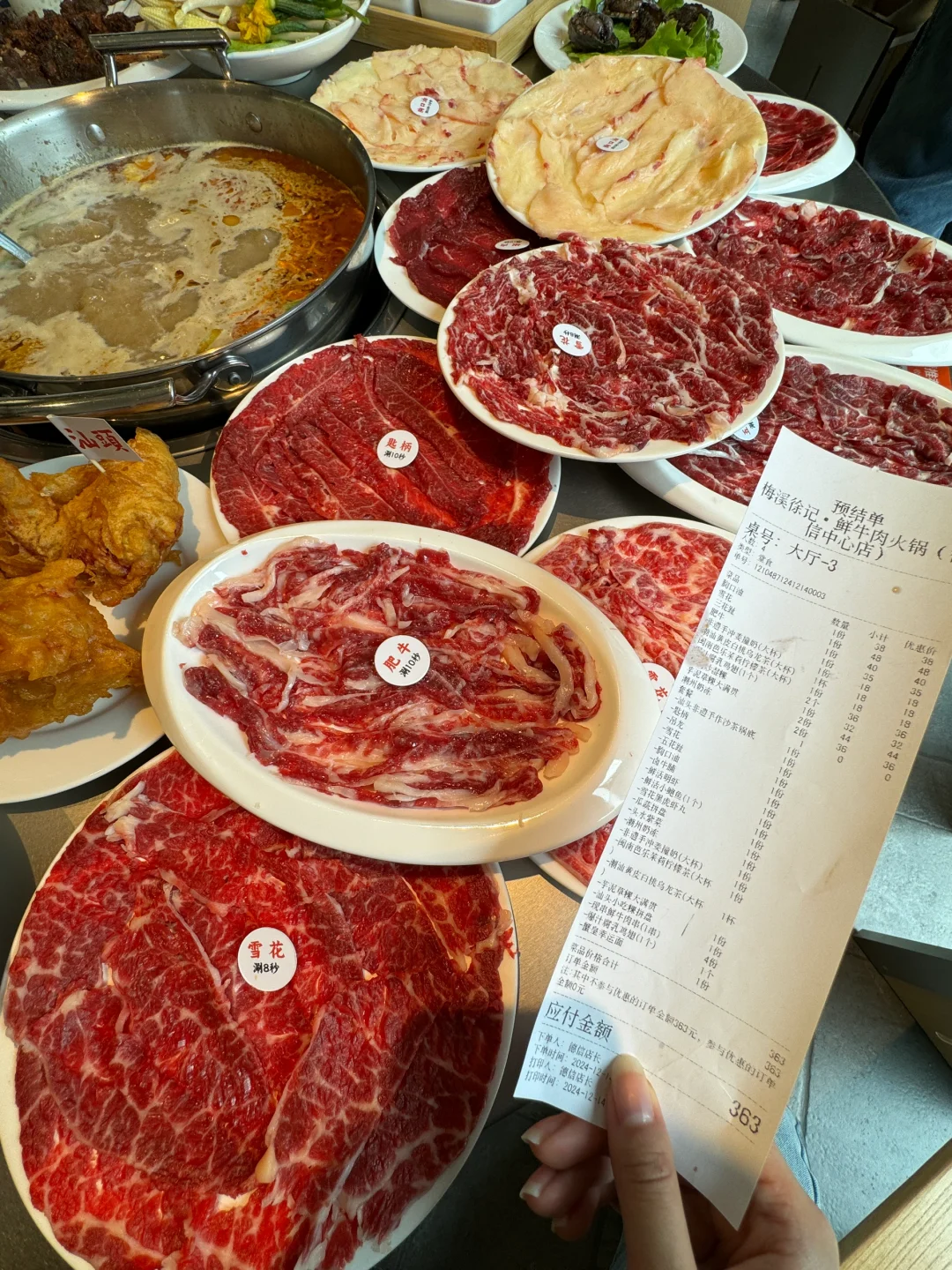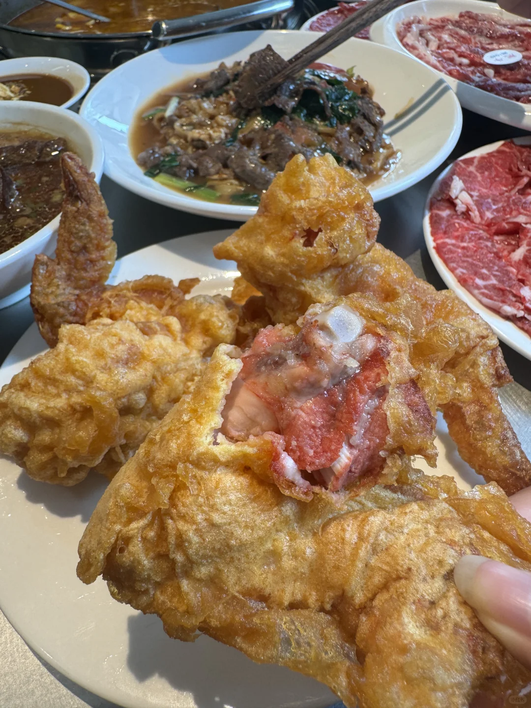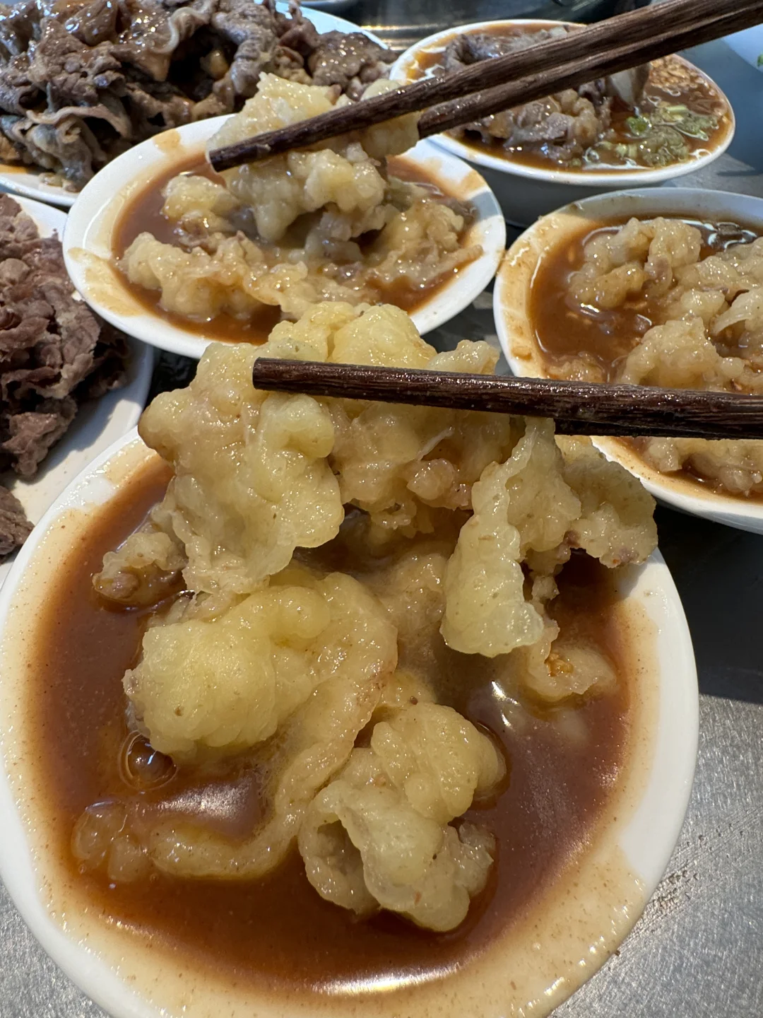 是我近期吃过坠坠好吃的潮汕牛肉火锅了。。。。 和朋友一起点了一堆!各个部位的肉都很好吃!!! 我强推吊龙、雪花、胸口油!肉质都很鲜嫩! 轻轻涮个8秒蘸上沙茶酱和金蒜!!谁懂这一口的含金量啊。。。。还有各种汕头小吃都很正宗🔥腐乳鸡翅、潮州奶冻、各种草粿、卤牛肉都很好吃!!!
