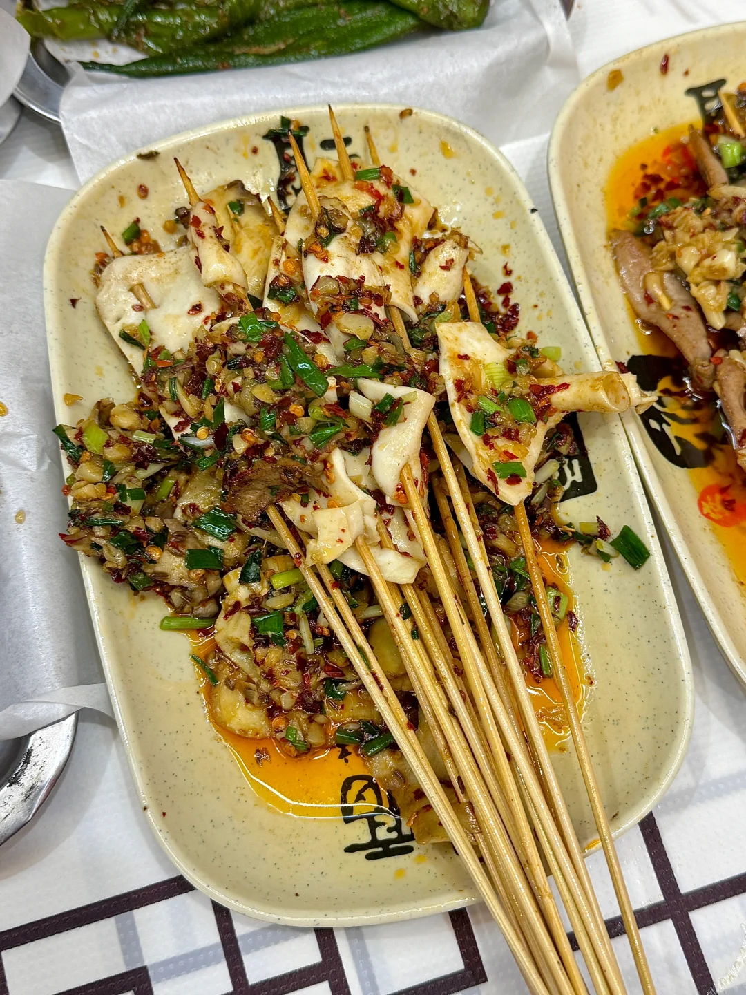 易俗河非肠不可的烈火牛肉真不戳呀👏从河西坐了一个多小时车来吃没有失望!! 熊熊烈火一番快烤,撒上孜然粒和辣椒粉,趁热吃下去,鲜嫩可口,特别香 烧烤类都不错,食材现串很新鲜,彩椒牛肉、五花肉、牛油、豆皮、油边是必点的 新出的铁板豆腐嚯嫩的,霸缸香肠蛋炒饭粒粒分明,香喷喷的,一整个碳水大满足!!