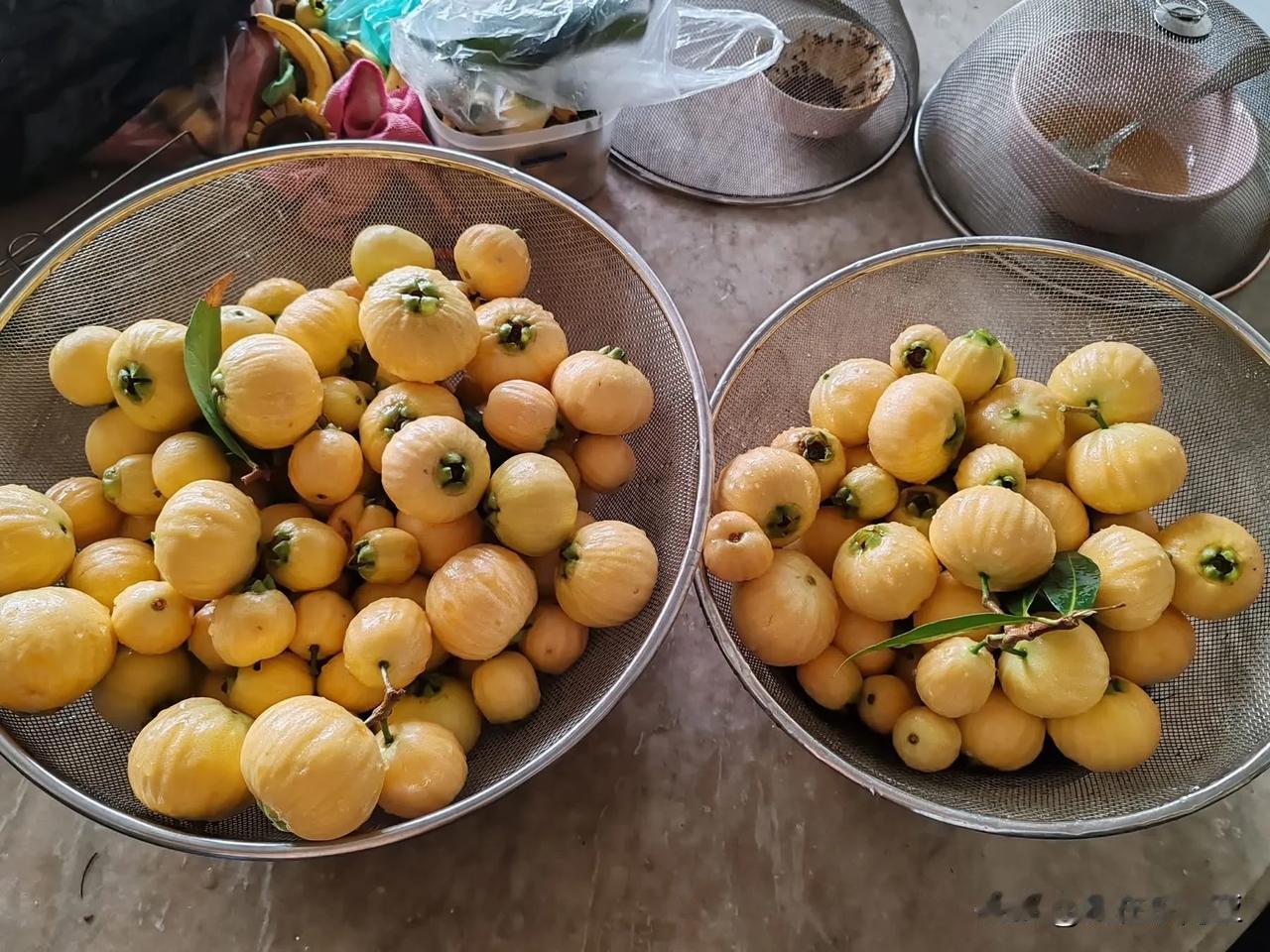 大豐收,有玫瑰和蘋果的芳香滋味,很好吃! PS:不是芭樂哦!是蒲桃又名香果或風鼓! 花蕊倒是和台灣水果~蓮霧比較接近,花葉樹型都像! 果實成熟時表皮呈黃色,有淡淡的玫瑰香氣,小鳥昆蟲都喜歡!